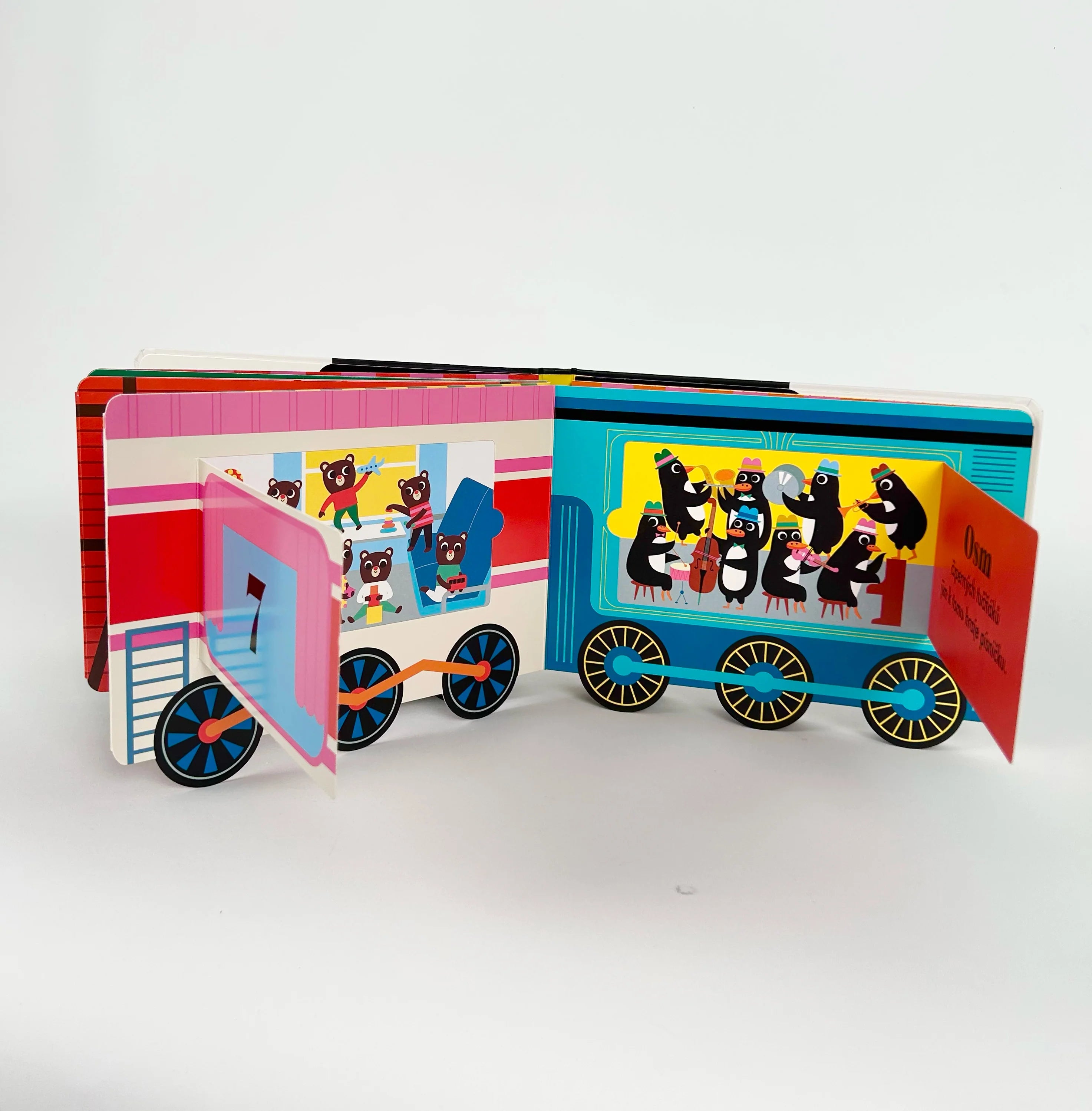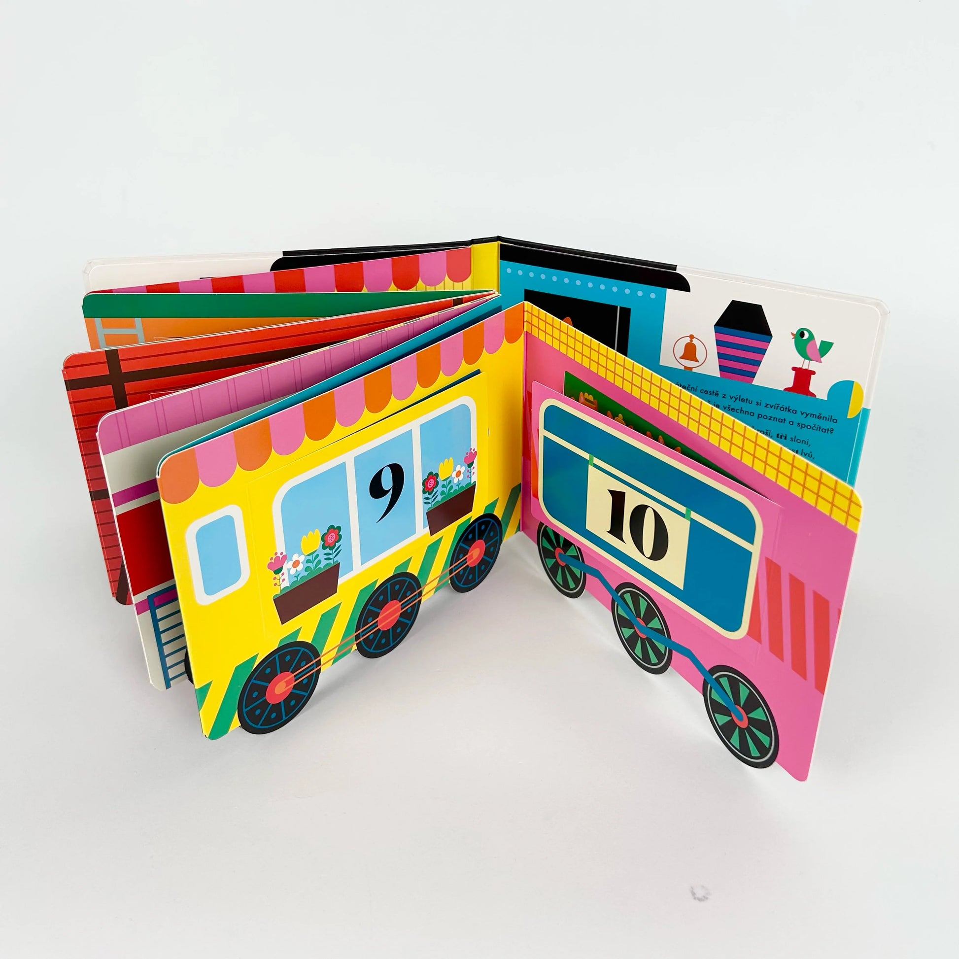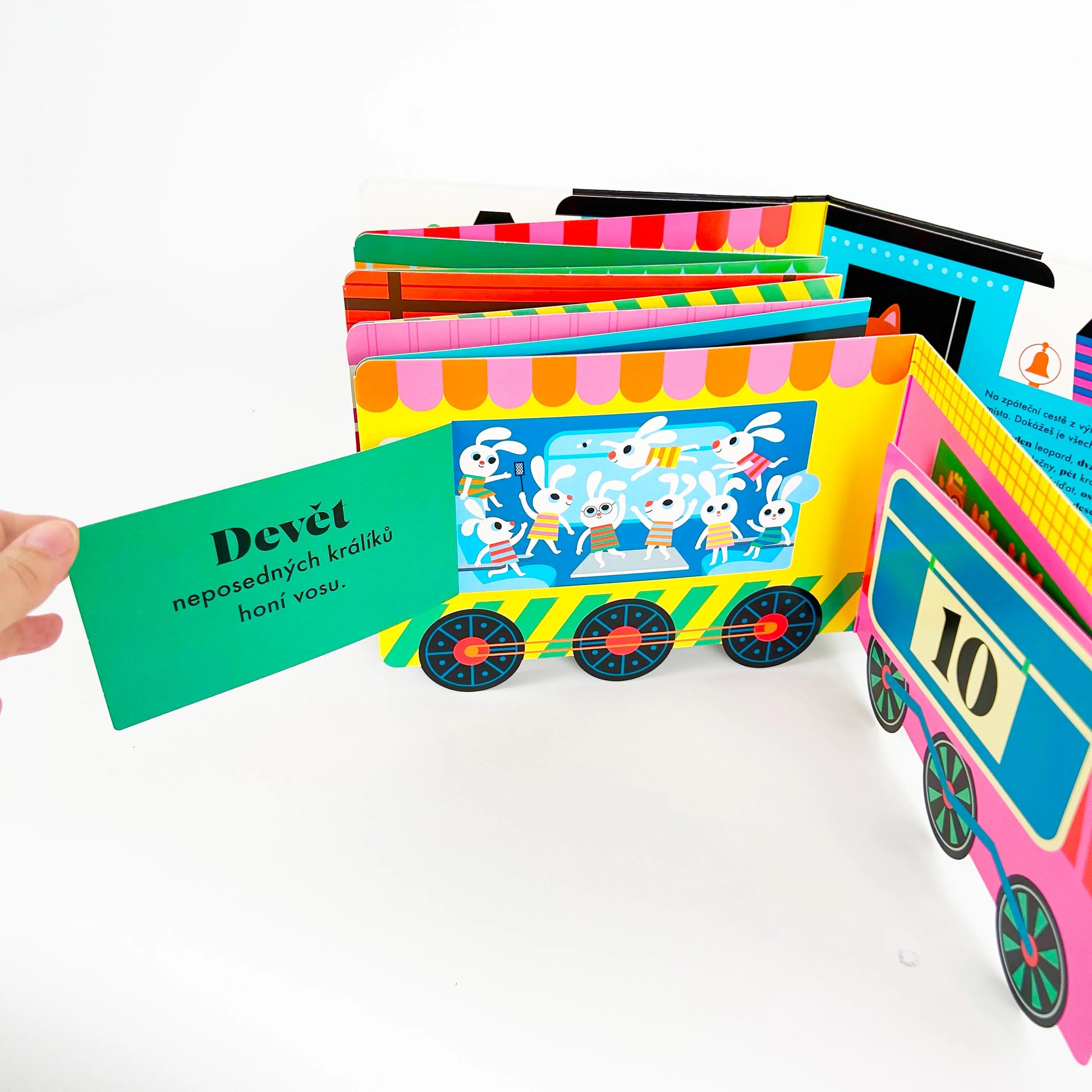 Nastupovat! Odjíždíme! Kdo si pochutnává na svačince? Kdo si zdřímnul? A kdo dělá ve vlaku tolik hluku? To vše zjistíte v tomto rozkládacím obřím leporelu (2 metry!! po rozložení) ve tvaru vlaku ilustrovaného světoznámou švédskou výtvarnicí Ingelou P Arrhenius. Učte se čísla, odklápějte okénka, užijte si rýmovaný text a scénky se zvířátky v každém vagónu. A pak knihu otočte a zahrajte si zábavnou počítací hru na druhé straně. Nakonec můžete knížku posouvat po šesti pohyblivých kolečkách.