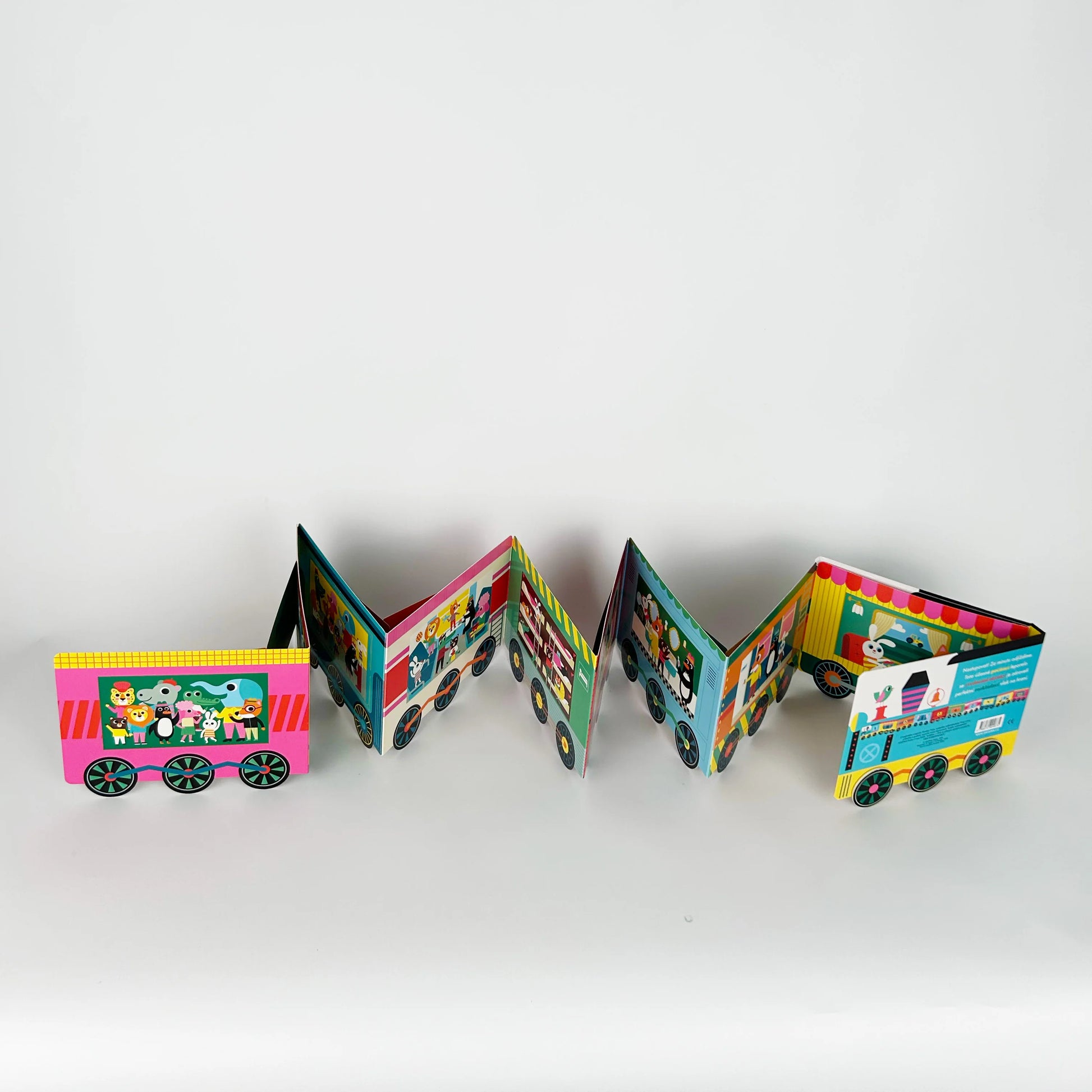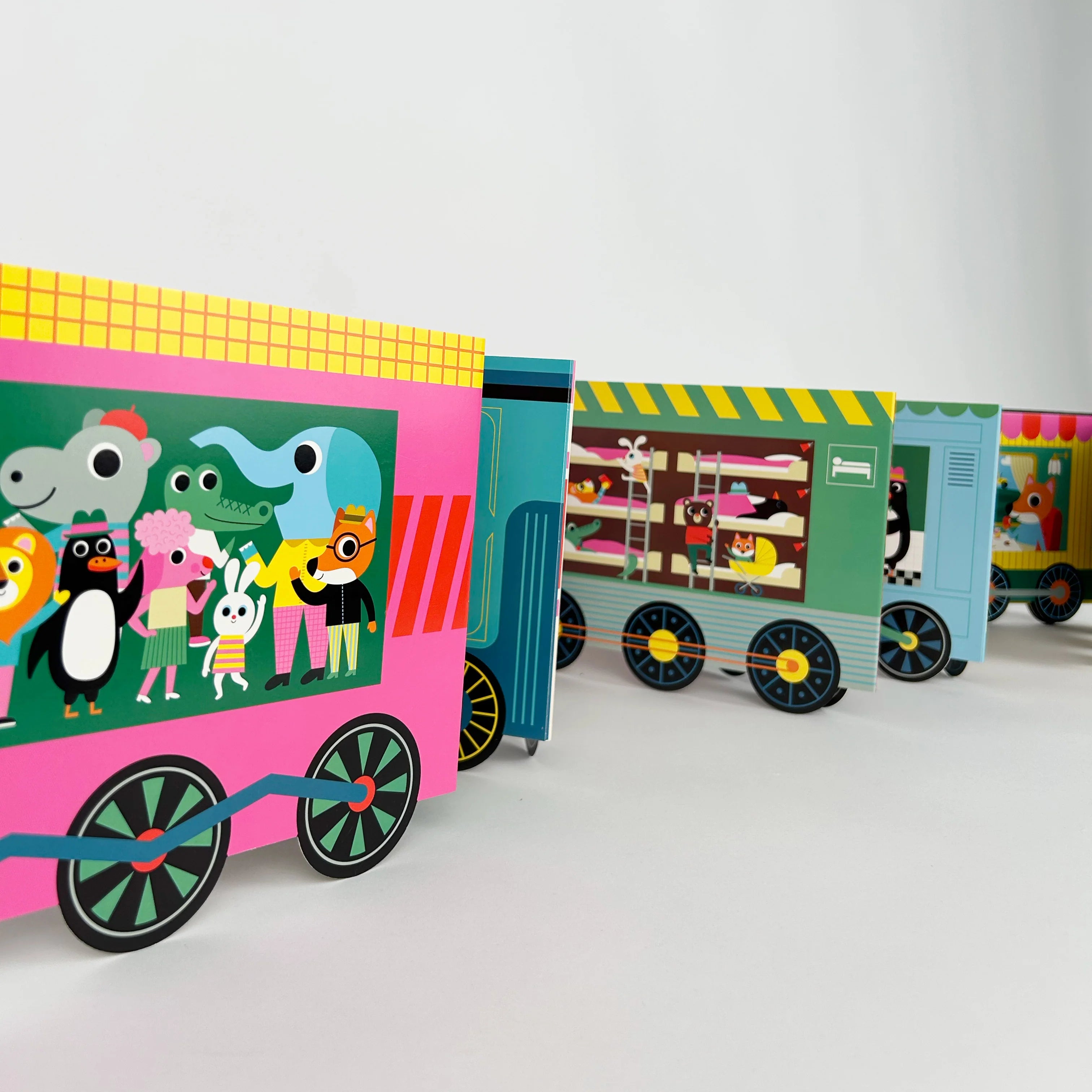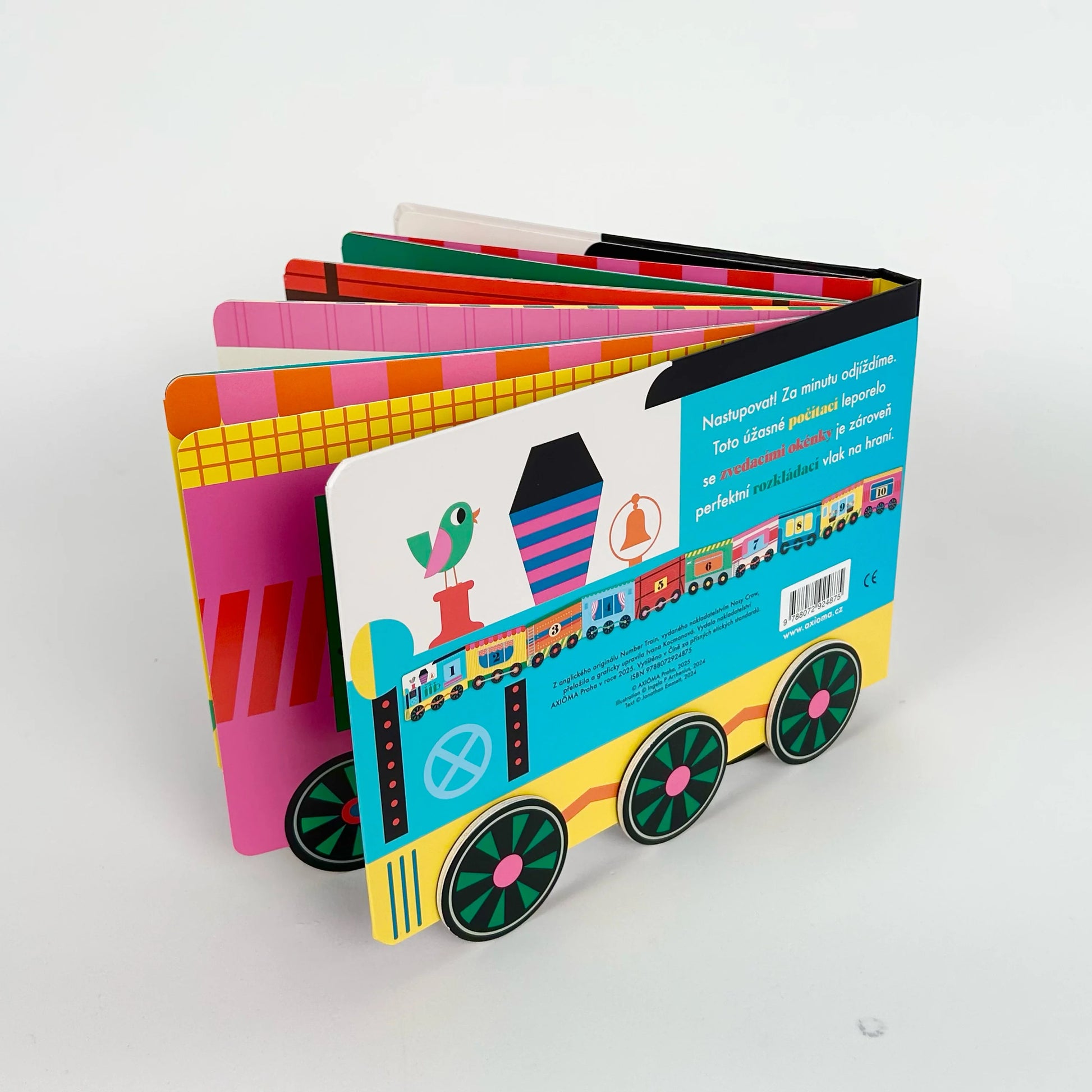 Nastupovat! Odjíždíme! Kdo si pochutnává na svačince? Kdo si zdřímnul? A kdo dělá ve vlaku tolik hluku? To vše zjistíte v tomto rozkládacím obřím leporelu (2 metry!! po rozložení) ve tvaru vlaku ilustrovaného světoznámou švédskou výtvarnicí Ingelou P Arrhenius. Učte se čísla, odklápějte okénka, užijte si rýmovaný text a scénky se zvířátky v každém vagónu. A pak knihu otočte a zahrajte si zábavnou počítací hru na druhé straně. Nakonec můžete knížku posouvat po šesti pohyblivých kolečkách.