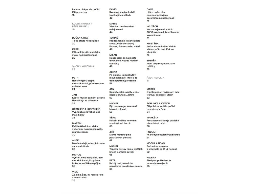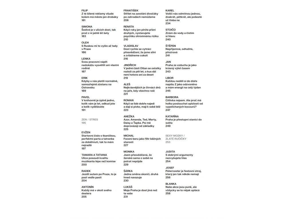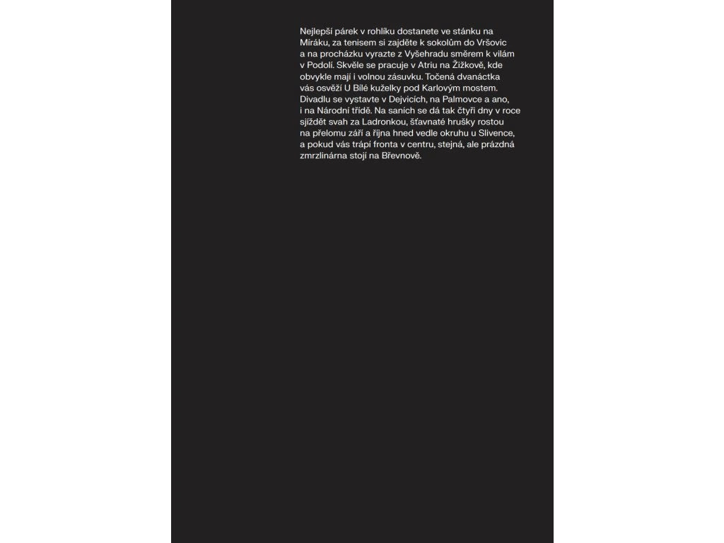 Obsahují to nejzajímavější, co jsem posbíral od mladých, starých, praktiků, teoretiků, požitkářů, šetřílků, návštěvníků, náplav, starousedlíků, pravičáků nebo levičáků. V centru i v místech, kde sídliště přechází v les. Na levém i na pravém břehu Vltavy. Nad městem i v podzemí.