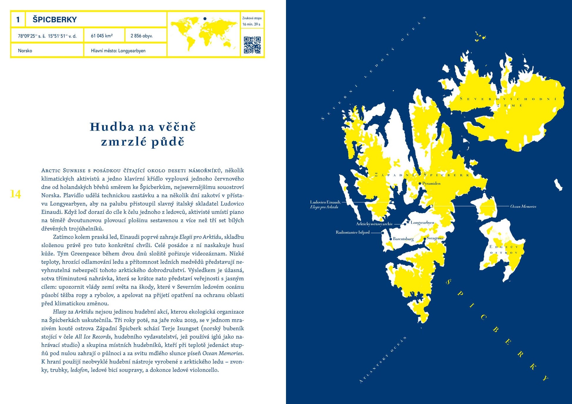 K naslouchání vzdáleným krajinám zvou čtenáře nejen příběhy, ilustrace a mapy, ale navíc i pečlivě sestavené playlisty, dostupné prostřednictvím QR kódu.