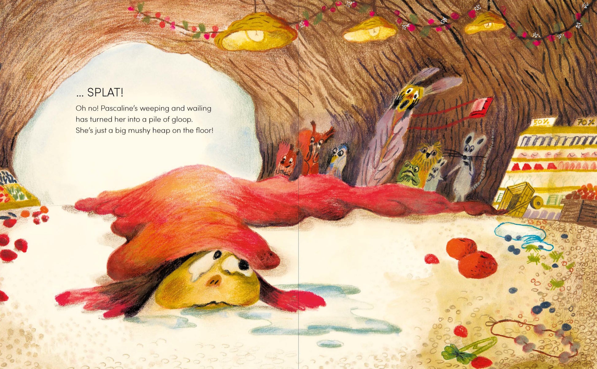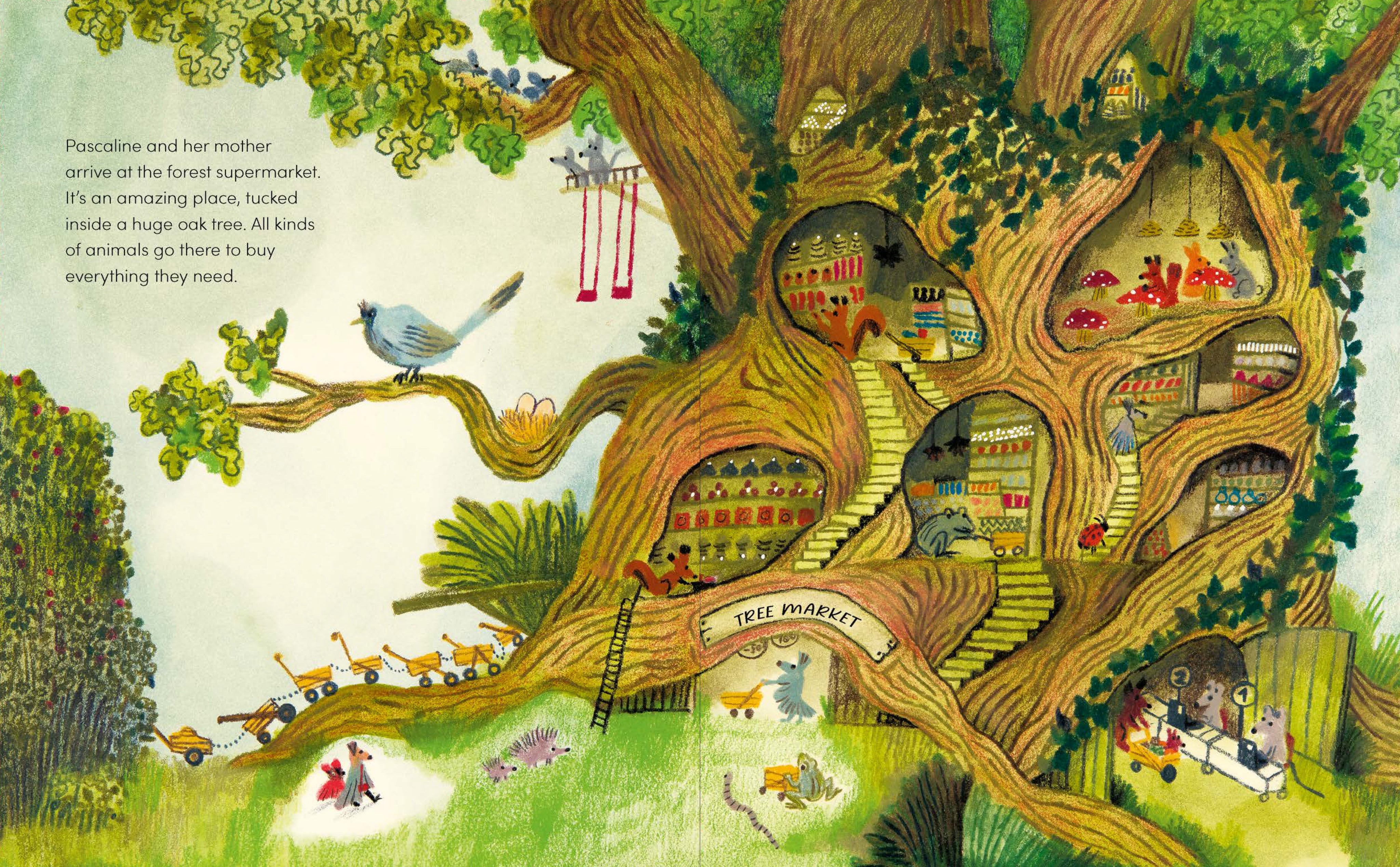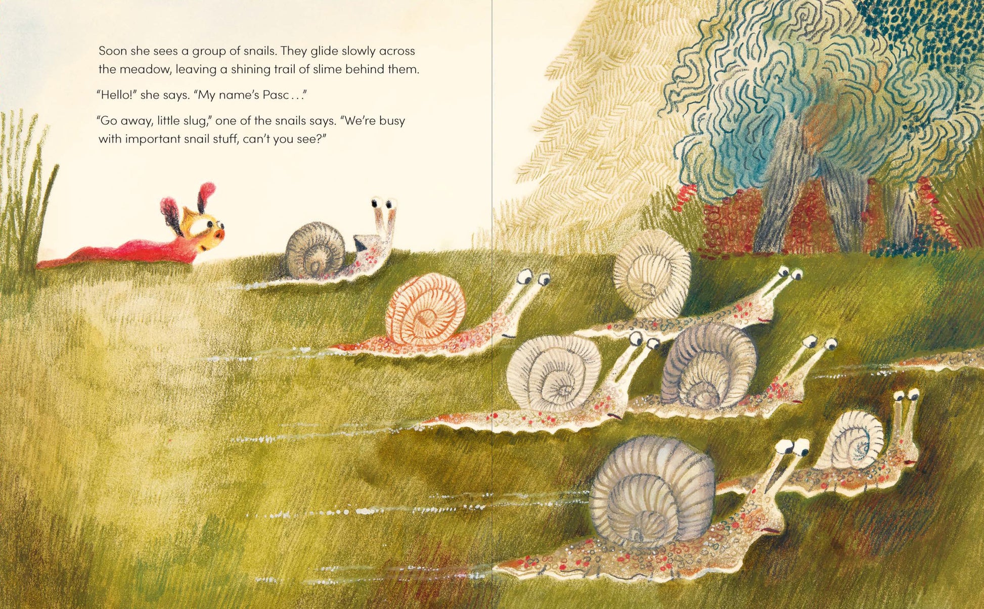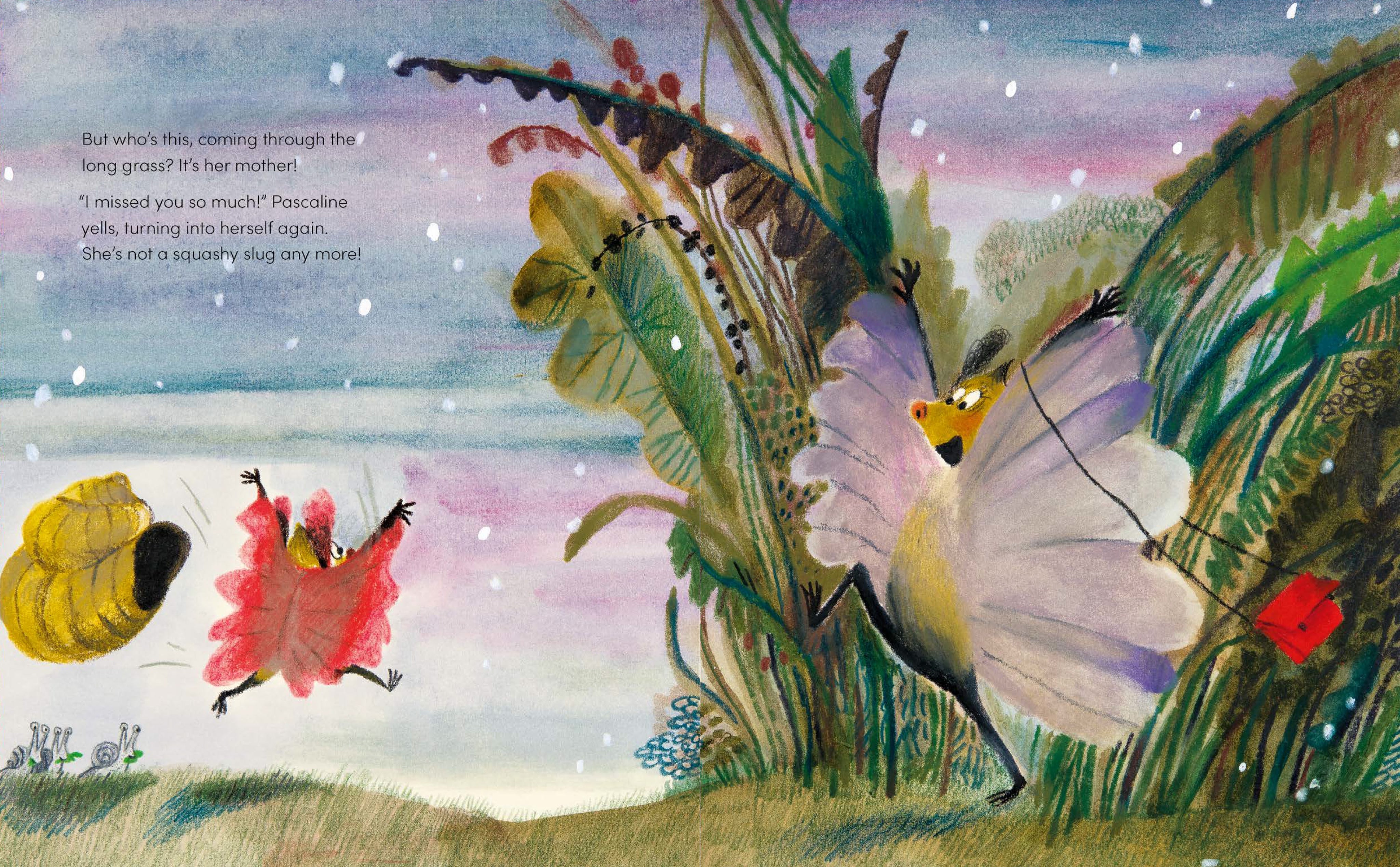 Alemagna pracuje s ilustrací jako s emocí. Kombinuje akvarel, pastel, tužku i fluorescenční růžovou pastelku, která vystřeluje Pascaline z tlumených barevných ploch.