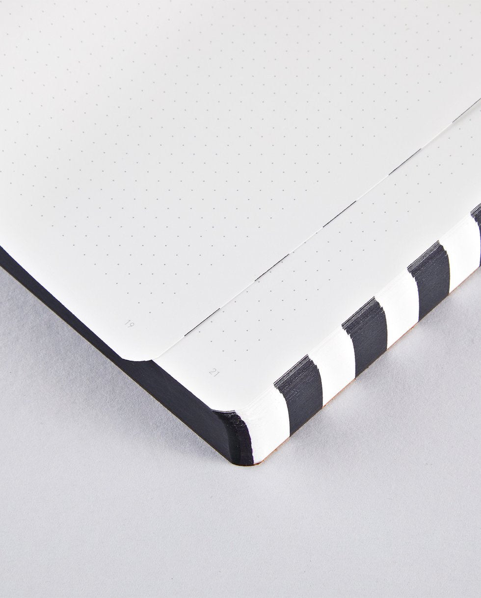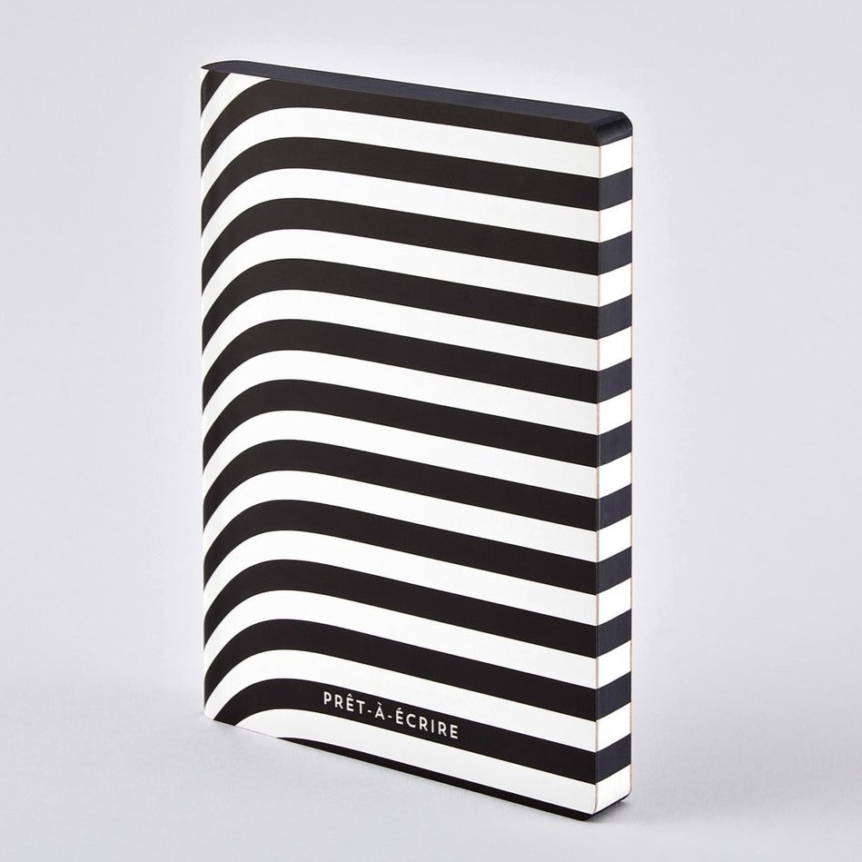 Ponieważ „Prêt-à-porter” oznacza „gotowy do noszenia”, „Prêt-à-écrire” oznacza „gotowy do pisania”. Ten rewelacyjny notatnik w czarno-białe paski jest gotowy do noszenia i pisania. To zarówno dodatek dekoracyjny, jak i elegancki dom do przechowywania notatek i myśli.