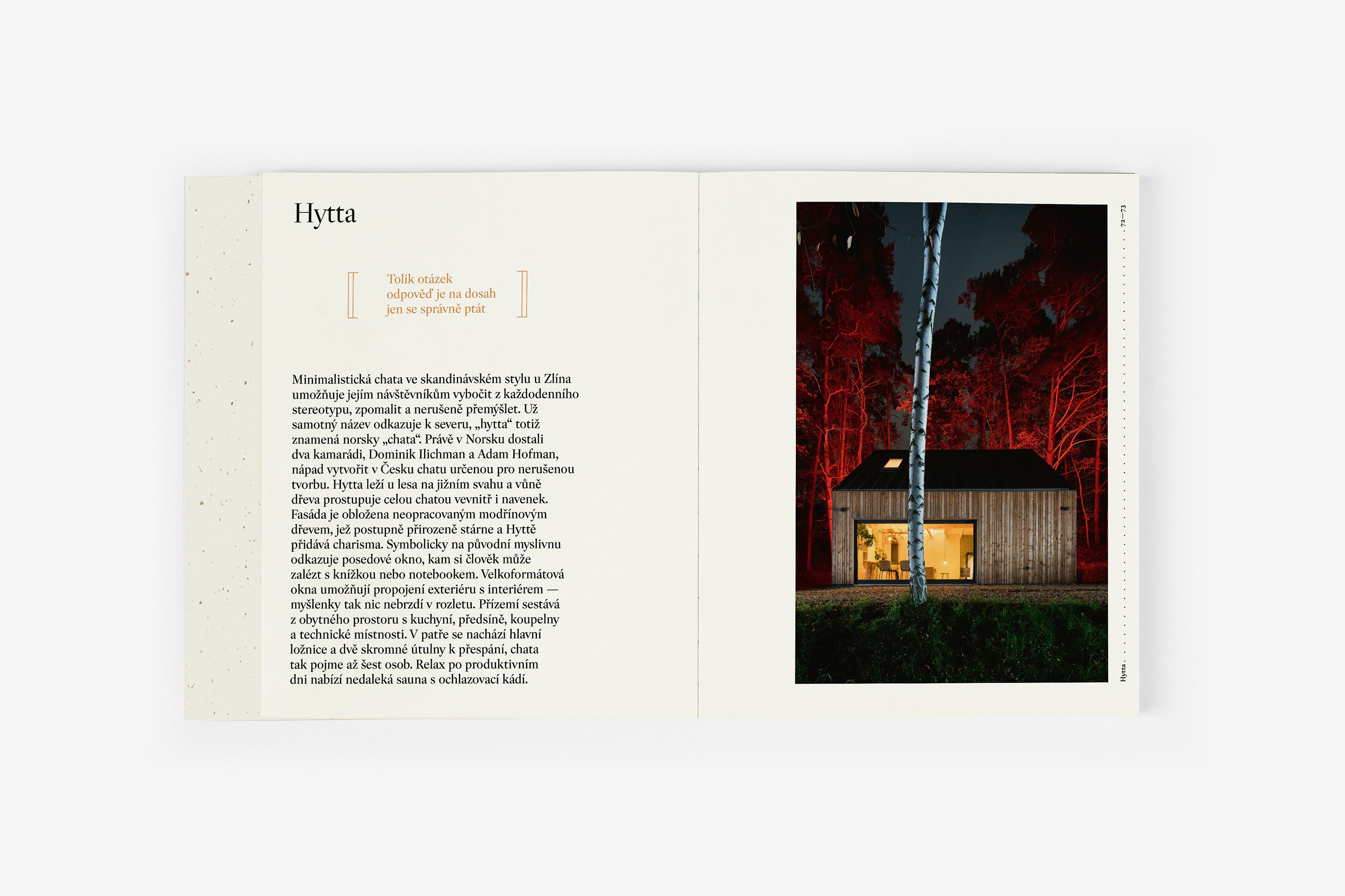 W książce autorzy przedstawiają cztery tuziny pięknych i ciekawych saun z Republiki Czeskiej i Słowackiej. Selekcję uzupełnia siedemnaście długich wywiadów, w których autorzy pytali doświadczonych architektów, projektantów, aromaterapeutów, ale także lekarzy o to, w jaki sposób korzystanie z sauny i sauny zmienia nasze doświadczenia życiowe i doświadczenia.