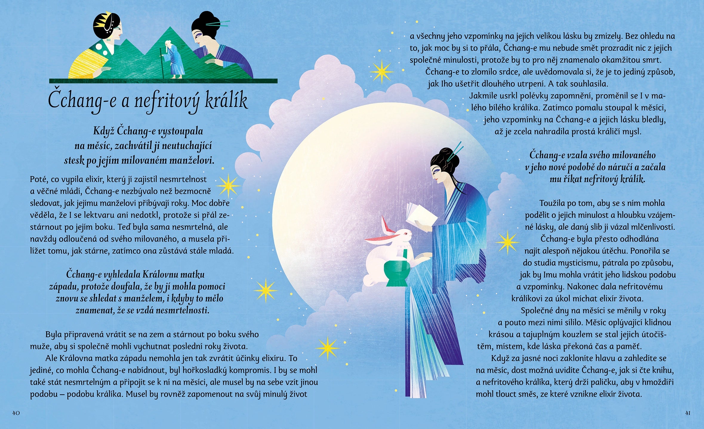 Prastaré příběhy, jež ožívají na stránkách knihy, představují průřez čínskou mytologií od stvoření světa po nástup prvních císařů a kromě mnoha příběhů nabízí čtenářům i řadu zajímavostí z oblasti kultury a náboženství či informací o každodenním životě v dávné Číně. Dozvíte se mimo jiné, proč je při oslavách čínského nového roku nutné dělat co největší rámus, jak lučištník I sestřelil z nebe devět sluncí a jak vznikl čínský zvěrokruh. Tak neváhejte, je čas nasednout na čínského draka, po stračím mostě přejít Mléčnou dráhu a připojit se k nefritovému králíkovi na měsíci…