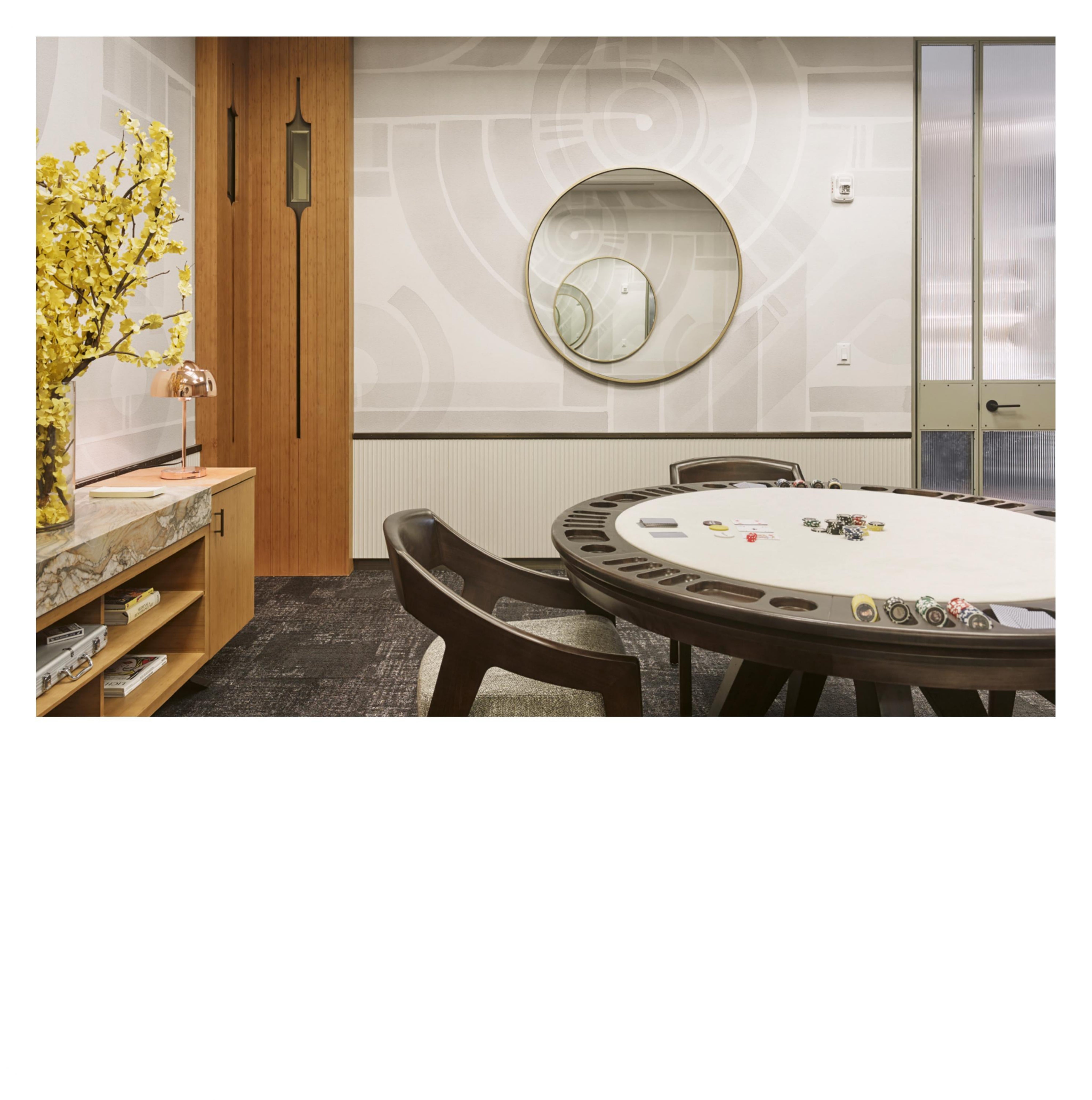 Projekt ilustruje, jak elementy rzemieślnicze wybrane podczas współpracy firmy z właścicielami domów nieodłącznie połączyły się w dopracowane wnętrza. Ten elegancki penthouse, położony na szczycie wspaniałego budynku Arabella, z widokiem na wspaniałą panoramę Houston, charakteryzuje się wyjątkowymi materiałami, detalami i kunsztem wykonania, od specjalnych przesuwanych drzwi, wyjątkowo umieszczonej szafki z ciekawostkami i oszałamiających dzieł sztuki dostosowanych do każdego pokoju. które razem tworzą wspaniałe historie, które łączą mieszkańców z dbałością o własne kolekcje, wizją i atmosferą każdej przestrzeni oraz energią panującą w ich domu.