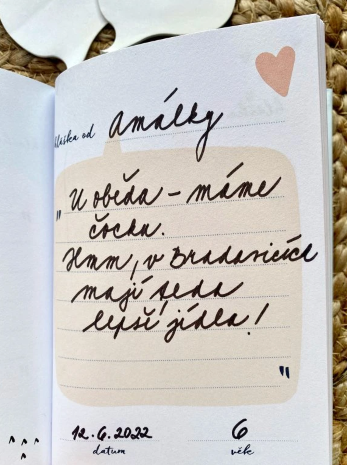Zápisník nabízí strukturovaný, ale hravý prostor pro zapisování hlášek – dostatek místa pro citát, datum i krátký kontext. Nejde jen o nahodilé poznámky; díky promyšlenému členění se z něj postupně stává rodinná kronika plná autentických momentů.