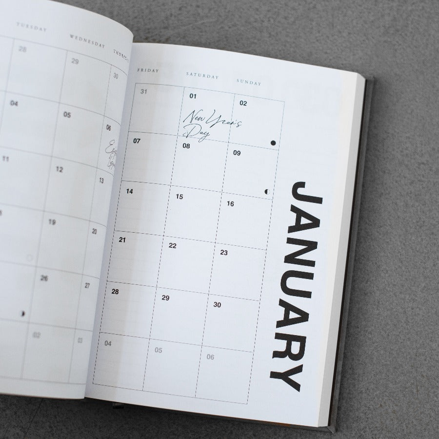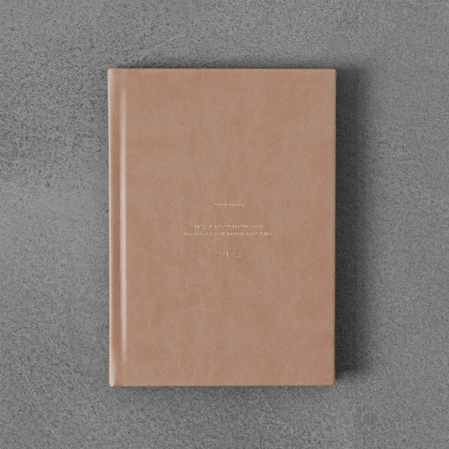Ten pamiętnik ma twardą okładkę, wykończoną piękną sztuczną skórą w kolorze migdałowego brązu i detalami ze złotej folii. Strony wewnętrzne są całkowicie czarno-białe i mają stylowe, minimalistyczne wykończenie.