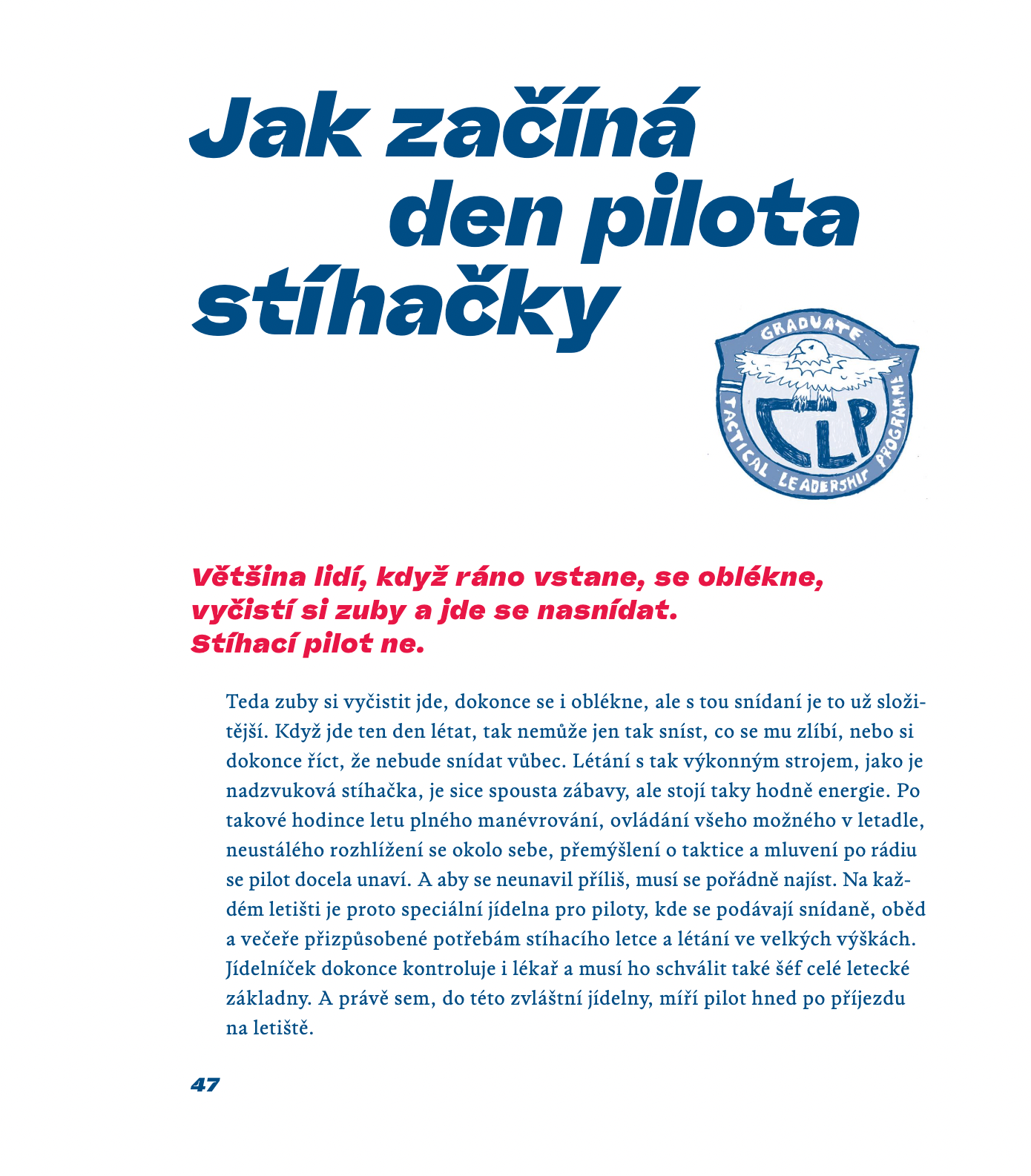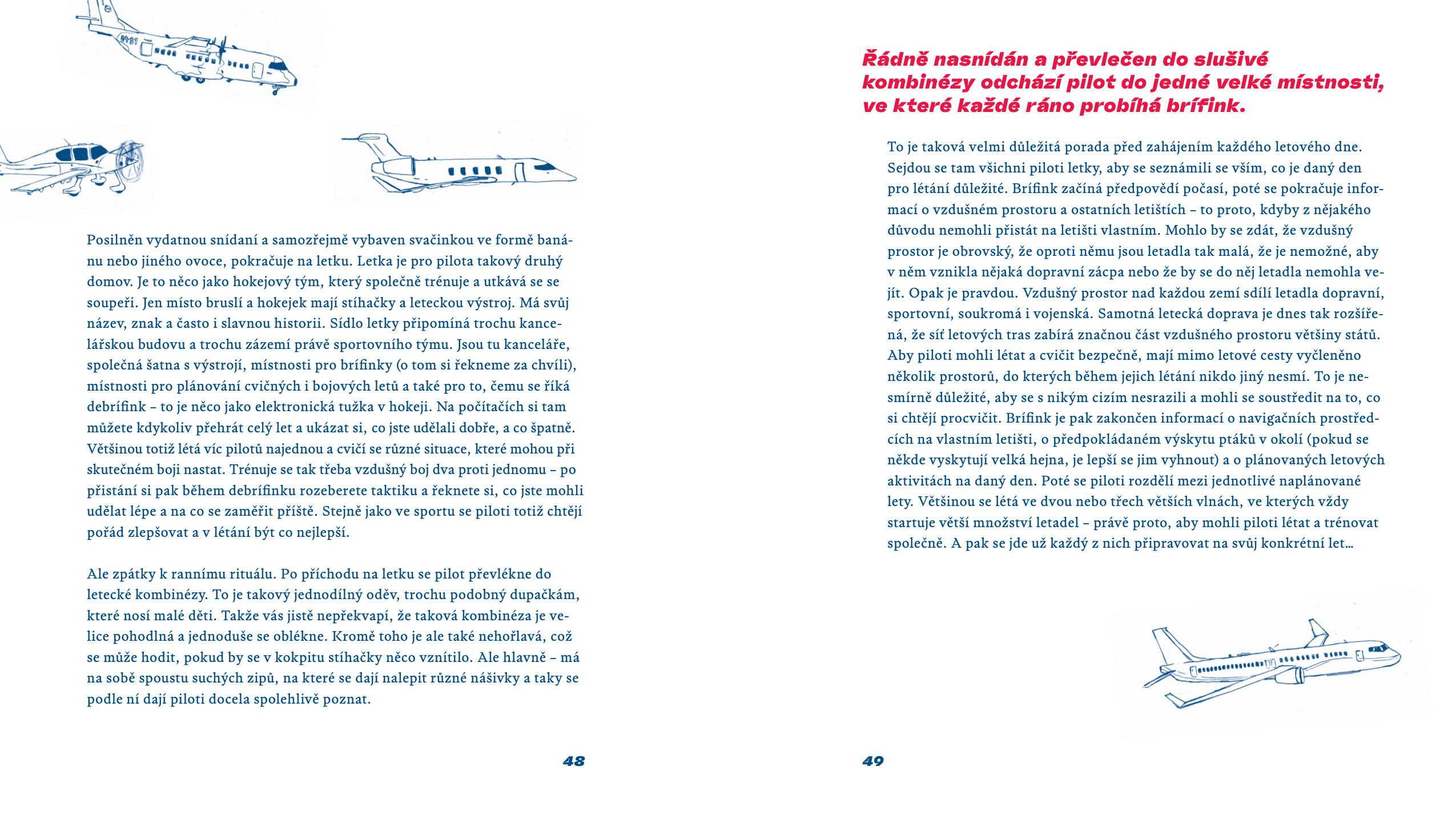 Až vyrosteš, přeješ si naučit se pilotovat stíhačku? Nebo tě jen baví pozorovat letadla, fascinují tě kokpity, pilotova výstroj, letecká akrobacie nebo kluzáky? V téhle barvité knížce tě s tím vším seznámí opravdový český bojový pilot a první český astronaut! Ukáže ti, jak to vypadá ve výcvikovém centru, uvnitř stíhačky, mezi mraky, jak se tankuje během letu. Provede tě běžným dnem stíhacího pilota, tréninkem, proletí se s tebou nocí. Představí ti to, jak se trénuje na simulátoru nebo jak je náročné manévrovat. Vzhůru do oblak!