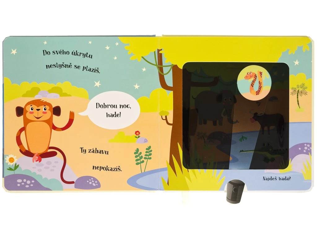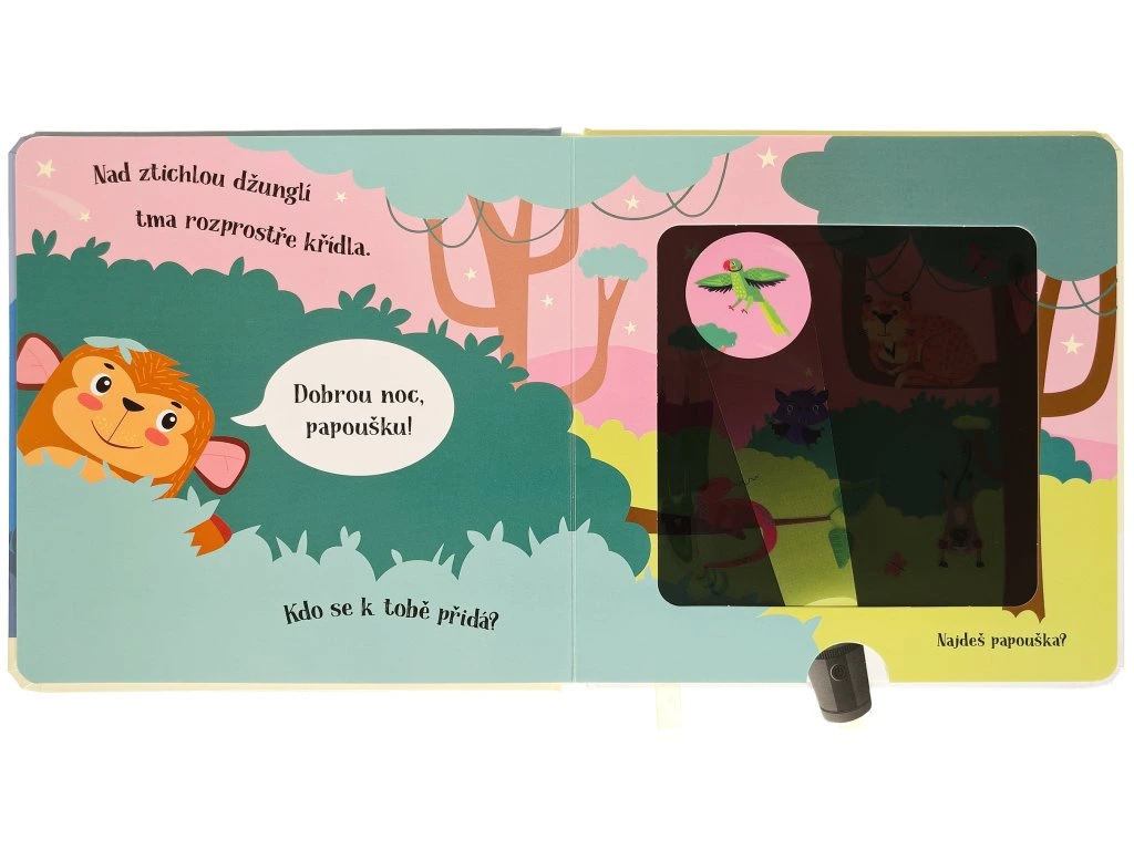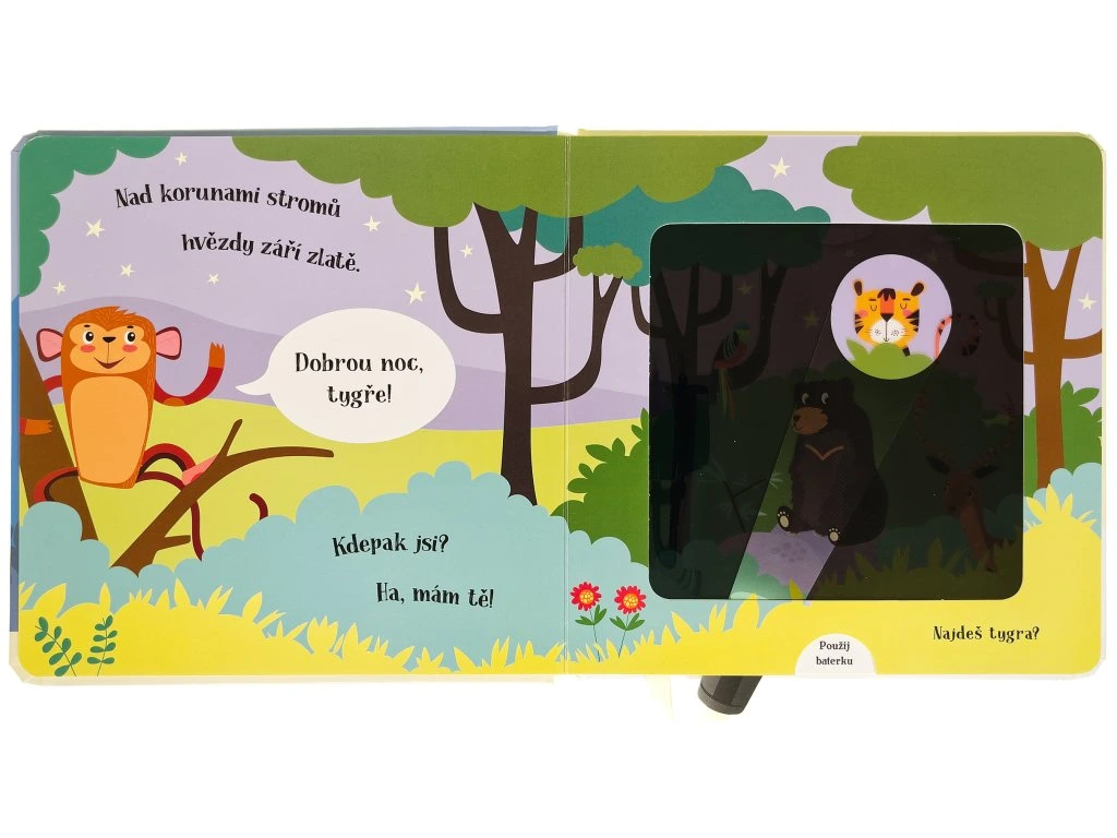Kouzelné čtení na dobrou noc pro děti. Malá opička už se chystá spát, ale nejprve musí dát dobrou noc všem svým zvířecím kamarádům. Pomůžeš jí je najít? Vsuň kouzelnou baterku mezi stránky a zjisti, kdo se ukrývá v každé ilustraci, zobrazující noc. Text ve verších učí děti vnímat přirozený rytmus řeči. Chytře vyrobená okénka umožňují dětem hledat schovaná zvířátka pomocí přiložené kartonové pomůcky ve tvaru svítilny. Nabídněte svému dítěti před spaním nějakou zklidňující aktivitu. Tato knížka je pro to přímo stvořená.