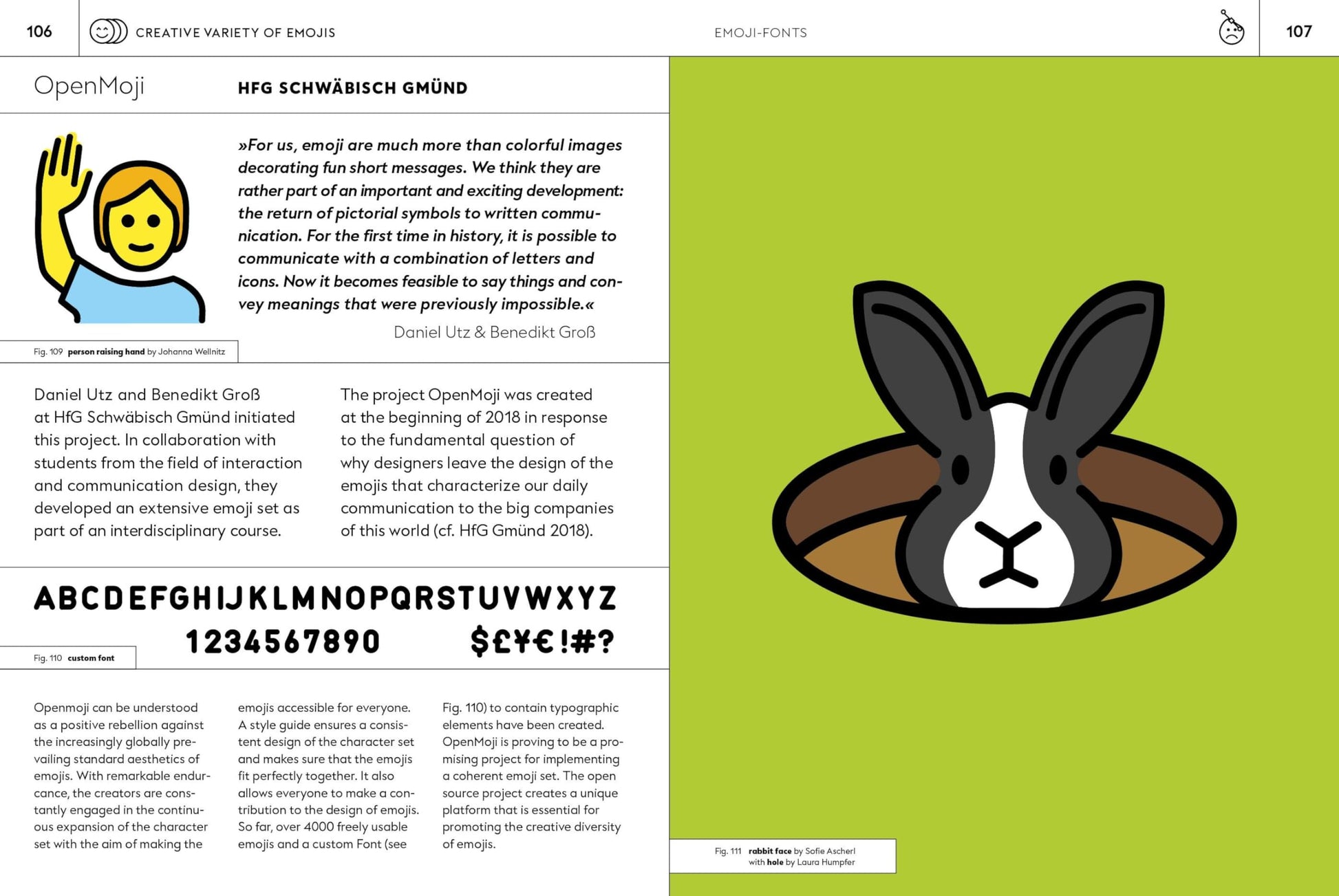 Graphic designer Deborah Enzmann with a degree at the Lucerne School of Design worked at a branding agency in Zurich and then completed her doctorate on the topic of emojis at the Offenbach University of Applied Sciences and Arts. She currently teaches communication and media theory at the Mannheim University of Applied Sciences.