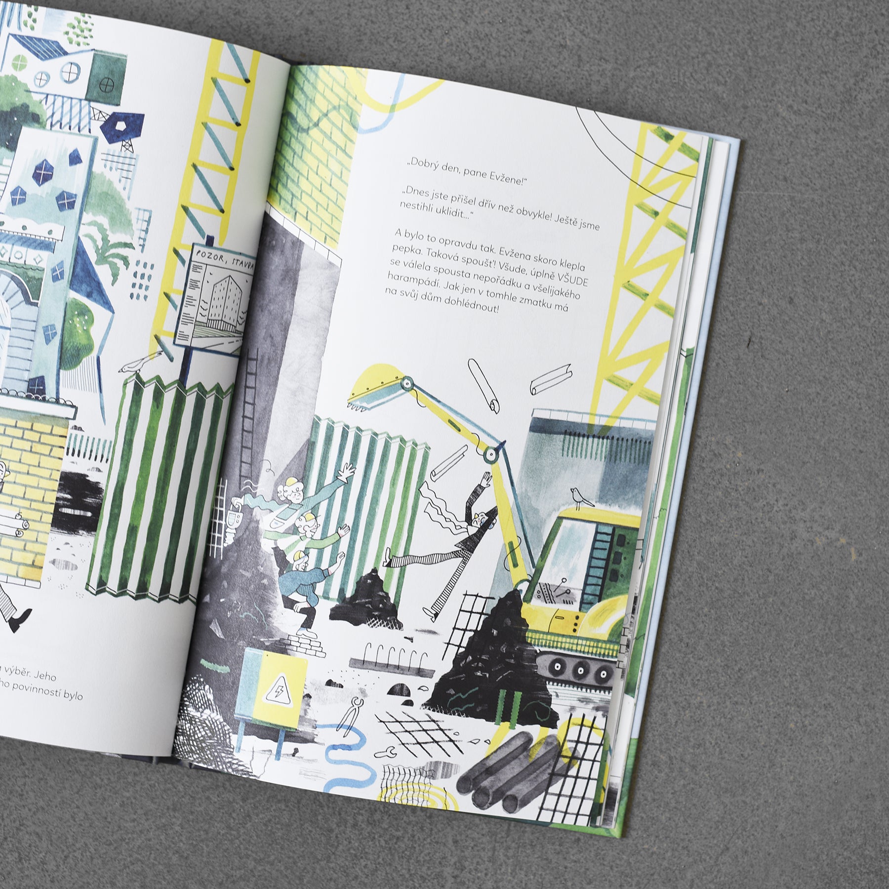 Punktualni to ludzie, którzy lubią wszystko schludne, dobrze ułożone, krótko mówiąc, na temat. I taki właśnie był architekt Evžen. W domu panował porządek, jakiego nigdzie indziej nie widziano, wszystko ułożone od najmniejszego do największego i od najczarniejszego do najbielszego. Pewnego dnia jednak wydarzyło się coś bardzo dziwnego i Evžen zrozumiał, że piękny dom nie buduje się tylko według władcy. Wszystko było spowodowane wiatrem. Jego silny podmuch wbił drzewo w trzecie piętro nadchodzącego budynku, dokładnie tam, gdzie miał znajdować się pokój. Jednak ku zaskoczeniu wszystkich Evžen nie kazał wyciąć drzewa. Wydawała mu się absolutnie idealna, więc pozwolił jej rosnąć w domu. I zaczął zauważać przyrodę i ludzi. Książka francuskiego ilustratora i architekta przywodzi na myśl legendarną twórczość Mirosława Šaška czy awangardową estetykę z jej artystyczną poetyką. Uczy dzieci dbałości o duże konstrukcje, współczucia dla najmniejszych stworzeń, zaufania do wyobraźni i odwagi przeciwstawienia się gustom większości.
