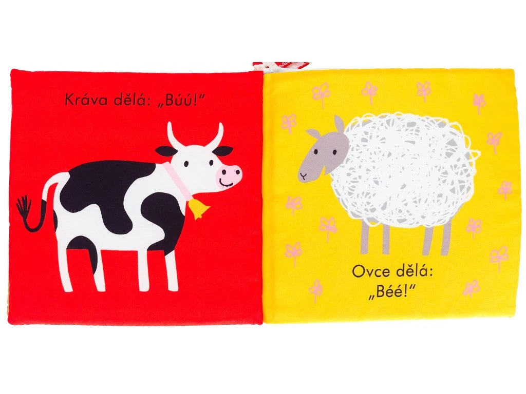 Knížečka kombinuje pestré syté obrázky lidí a zvířat se vzory s vysokým kontrastem, obsahuje první slova a jednoduchý příběh o farmě. Díky měkkému látkovému materiálu je perfektní i pro ta nejmenší miminka.