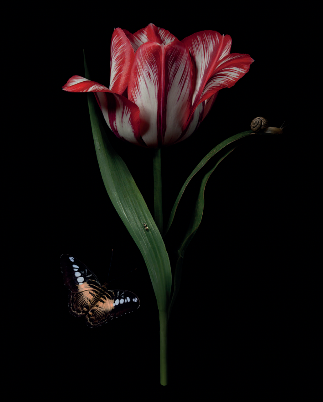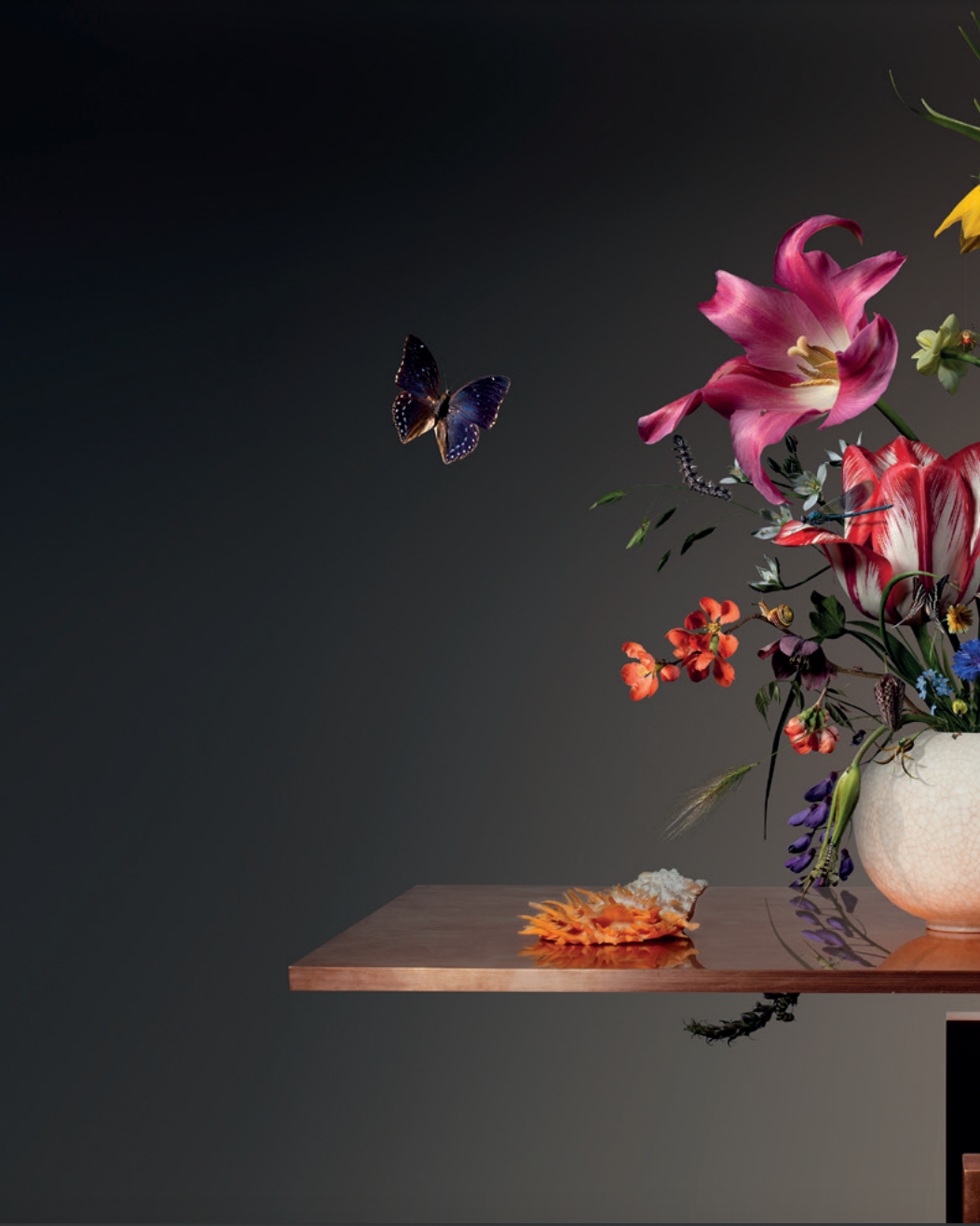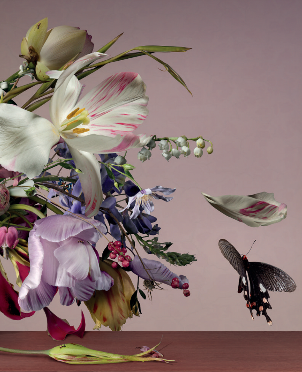 Asortyment kwiatów „Meeuws” wydaje się wyłaniać, ale znikać w atramentowo czarnym tle, zachwycając się ostrością, efektowną fakturą, porami i żyłkami.