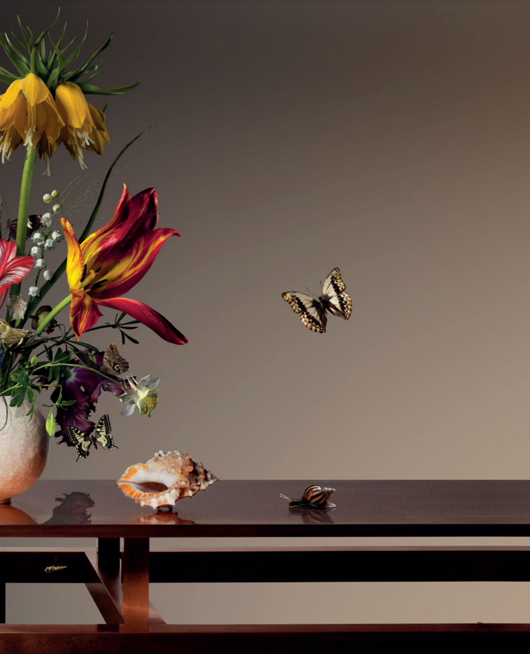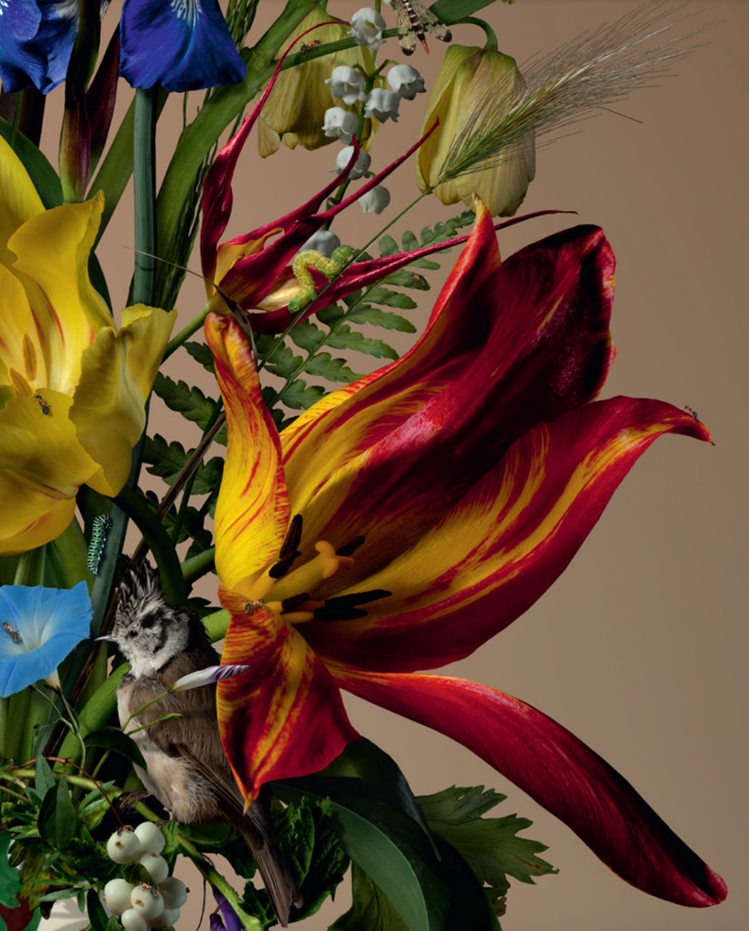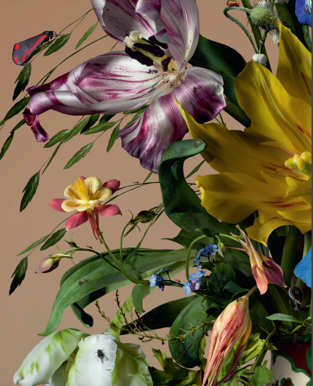 Asortyment kwiatów „Meeuws” wydaje się wyłaniać, ale znikać w atramentowo czarnym tle, zachwycając się ostrością, efektowną fakturą, porami i żyłkami.