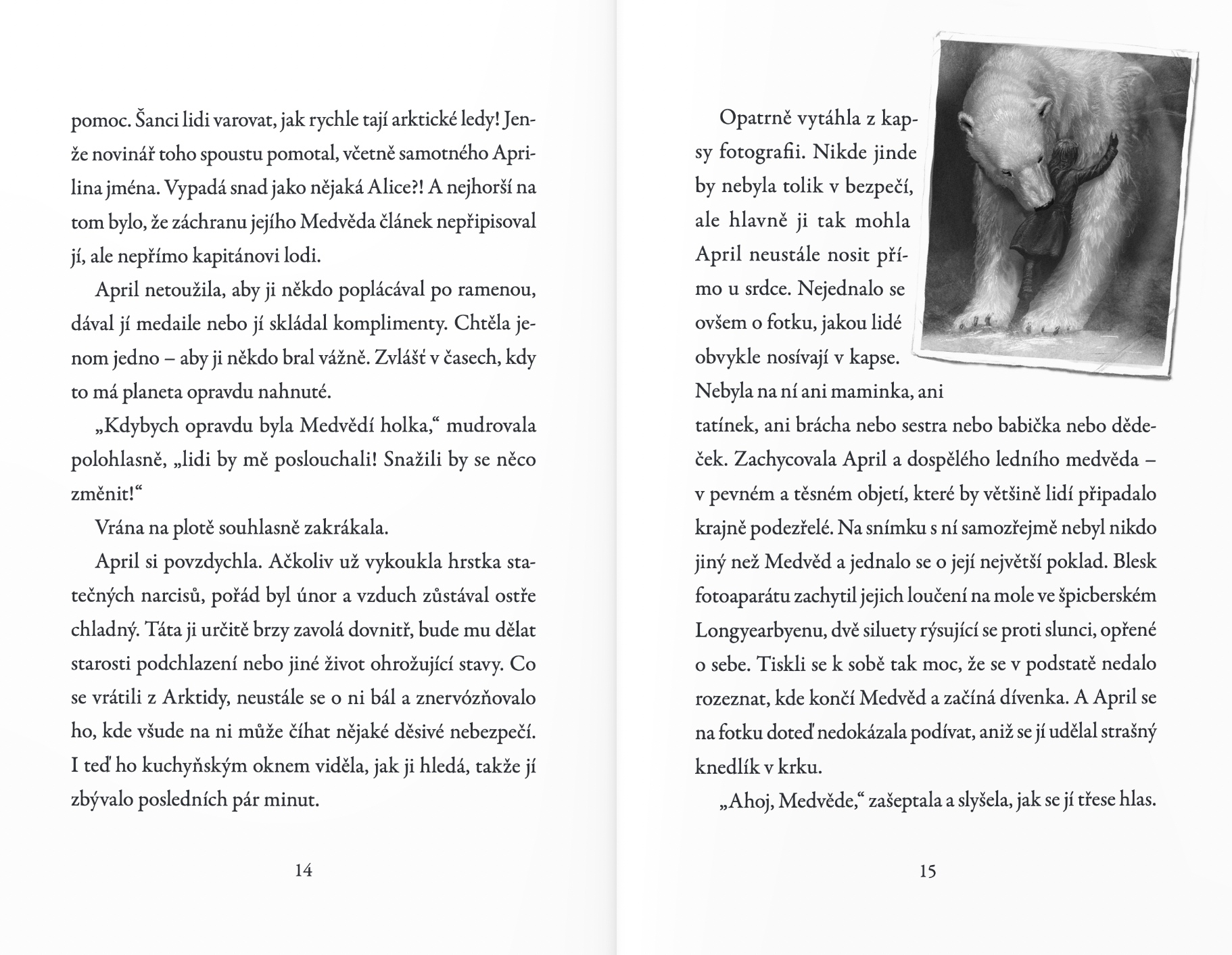 Uplynul víc než rok od doby, kdy se April Woodová vrátila domů z Medvědího ostrova s hřejivým pocitem, že zachránila posledního ledního medvěda, který zde uvízl, a dostala ho zpátky na Špicberky. Přesto nepřestává na chlupatého kamaráda myslet. Když se doslechne, že na Špicberkách jednoho medvěda postřelili, je přesvědčená, že to byl právě on. Vyděšená April přesvědčí tátu, aby se s ní znovu vydal za polární kruh. To ale ještě netuší, že na své cestě přes zmrzlou tundru a ledovcové pláně objeví maličké lední medvídě, které zoufale potřebuje její pomoc...