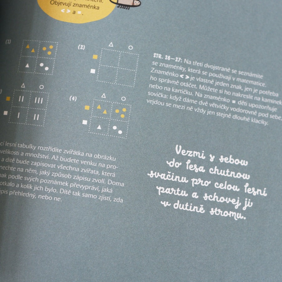 Książka o matematyce byłaby dość nudna… gdyby nie była tak zabawna! W końcu na każdym kroku spotykasz liczby, zasady, rytmy i kształty geometryczne. I dlatego zapraszamy na lekcję matematyki leśnej. Przeżyjesz wiele przygód i mnóstwo dobrej zabawy, będziesz wspinać się po koronach drzew, budować zamek, a nawet przekroczyć zalany strumień. Możemy zacząć? Świetnie! Jeż Jarda, gąsienica Zuzka i inne zwierzęta już na Was czekają.