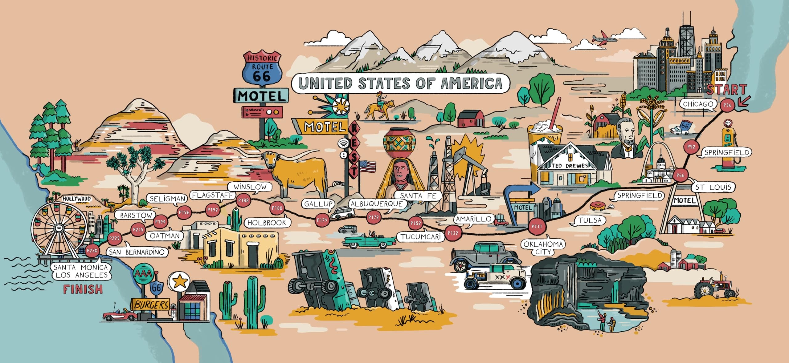 - Covers: Chicago to St Louis; St Louis to Joplin; Galena to Tulsa; Tulsa to Texola; Texola to Glenrio; Glenrio to Albuquerque; Albuquerque to Gallup; Lupton to Topock; Needles to Barstow; Barstow to Santa Monica; LA