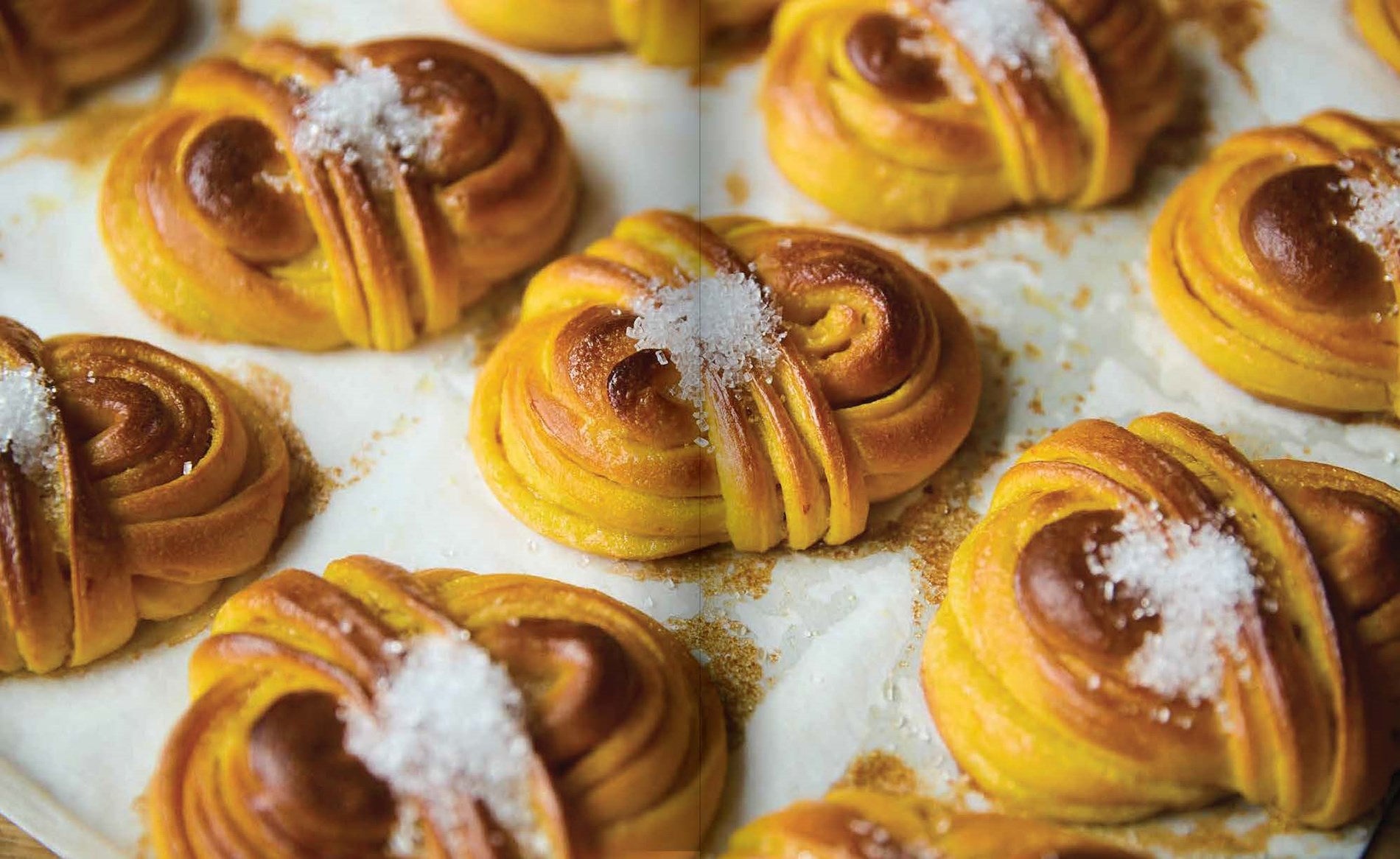 The book provides a thorough introduction to their sourdough breads, laminated puff pastry, and their world-renowned cardamom buns with recipes for bread, buns, croissants and cakes made with seasonal ingredients. In the Christmas chapter you can find recipes such as saffron scented Lucia buns, French nougat, and traditional Danish kransekage.