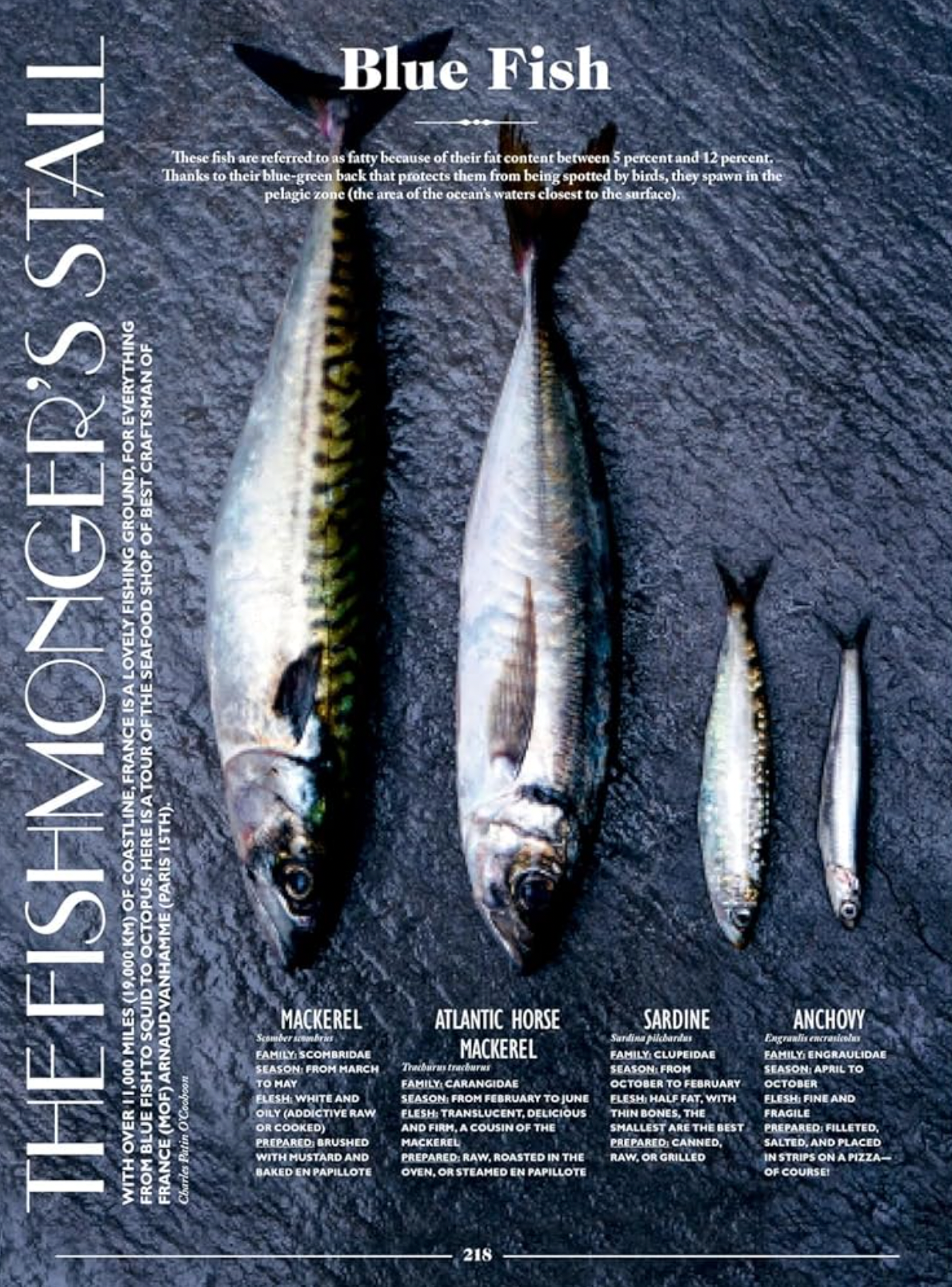 Oto klasyczne przepisy, m.in. jak zrobić pot-au-feu, osiem podstawowych skomponowanych sałatek, pasztet en croute, blanquette de veau, choucroute i najlepsze ratatouille. Profile ikon francuskiej kuchni, takich jak Colette i Curnonsky, Brillat-Savarin i Bocuse, dynastia Troigros i Victor Hugo. Indeks regionów, obejmujący słynne sery, wędliny i przepisy kulinarne z każdego obszaru. Przewodniki w formacie plakatu po francuskim chlebie, francuskich winach, francuskich ostrygach, a nawet francuskich frytkach. Spotkasz endywię, piękność północy; odkryj oś czasu rogalików; zrozumieć sztukę kamienia nazębnego; znajdź tabelę rozmiarów butelek wina, od maleńkiego podziału po Nabuchodonozora (odpowiednik 20 standardowych butelek); i podążaj za drzewem genealogicznym francuskich sosów.