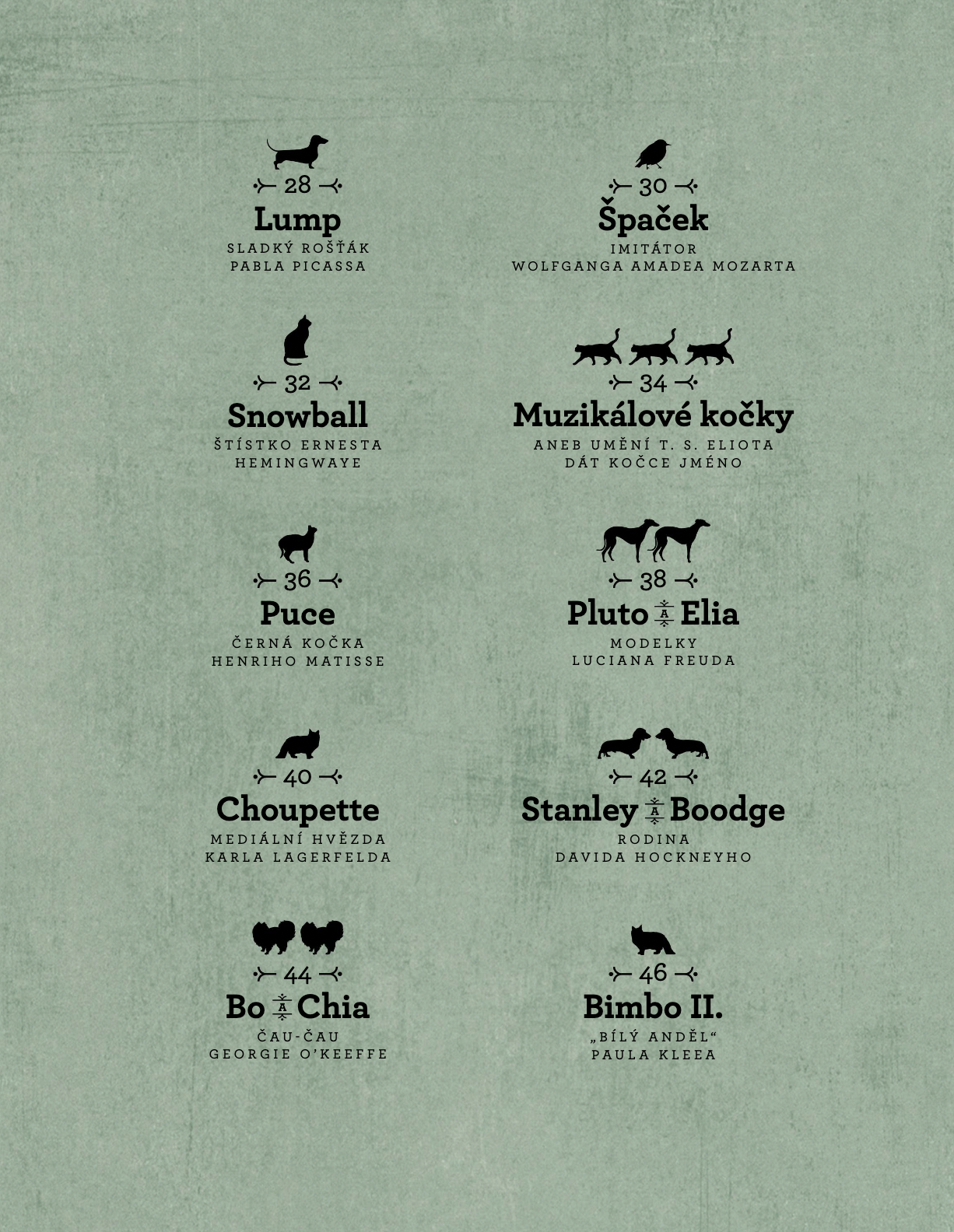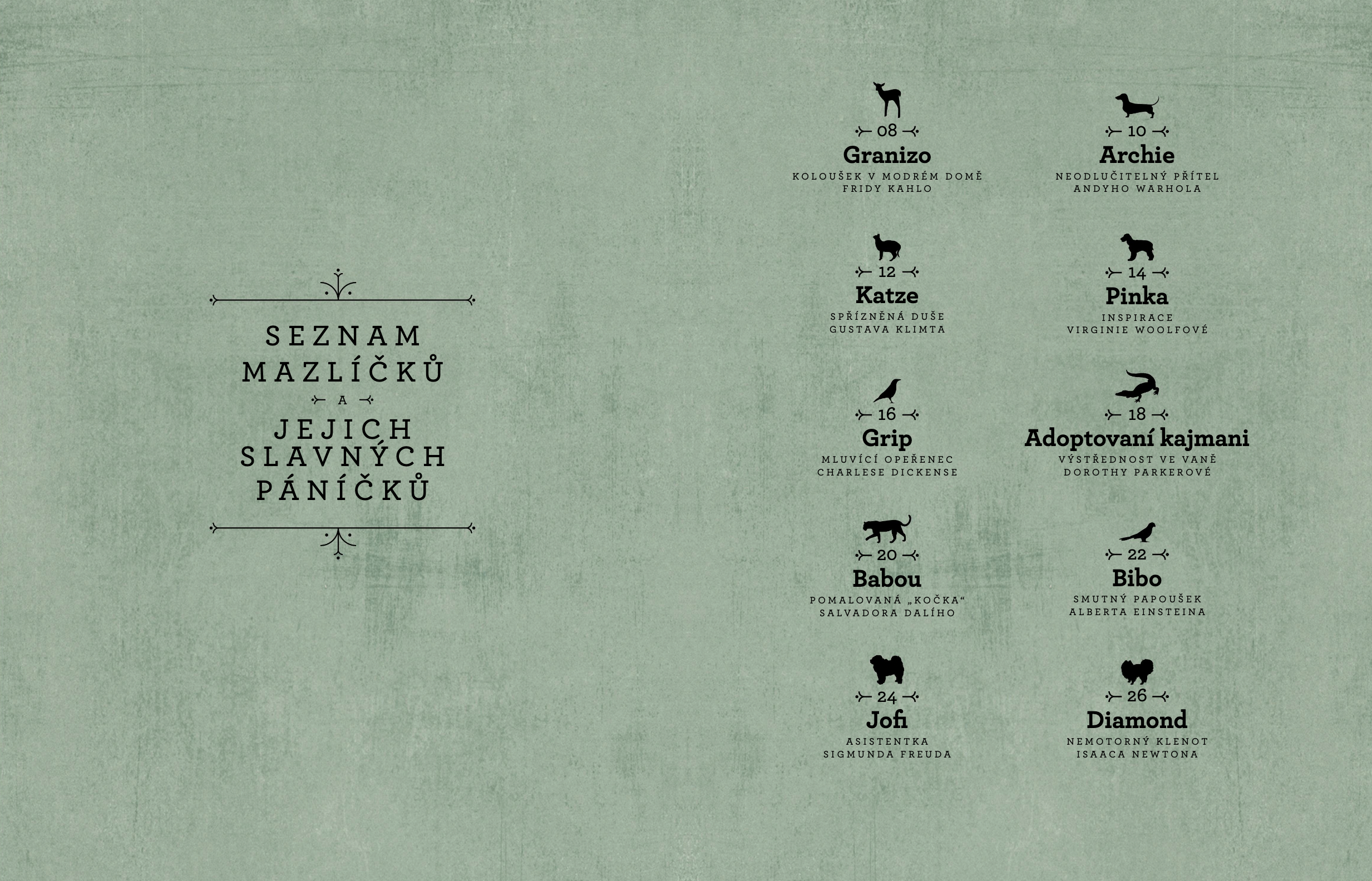 V této okouzlující sbírce příběhů se dozvíte o zvířecích miláčcích některých z nejvýznamnějších osobností historie. Například o jezevčíkovi jménem Lump, pro něhož měl slabost Pablo Picasso; o kolouškovi v patiu Fridy Kahlo, jehož zvěčnila na svých obrazech; o Jofi, psí psychoanalytičce, která pomáhala Freudovi při sezeních s pacienty; o papouškovi Bibo, jemuž Albert Einstein vyprávěl vtipy, aby ho rozveselil; nebo o Choupette, birmanské kočce, do níž se návrhář Karl Lagerfeld zamiloval natolik, že jí odkázal jmění.