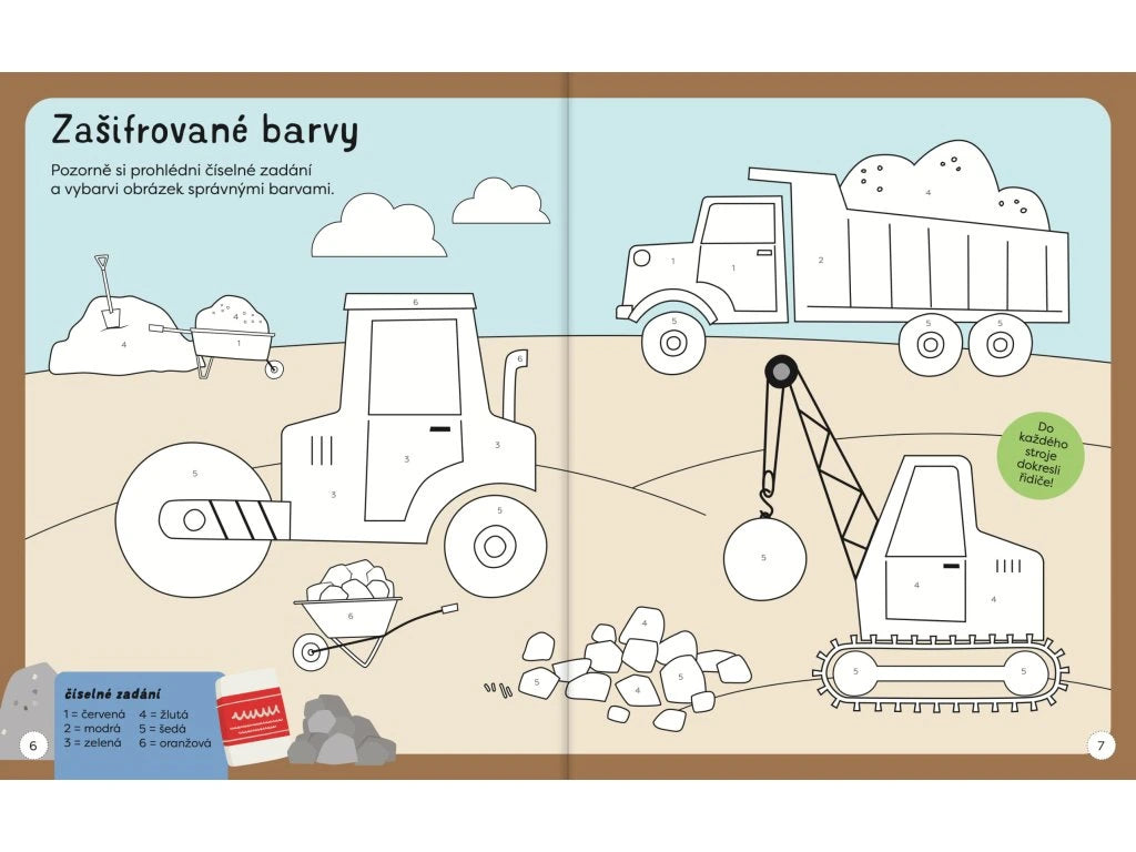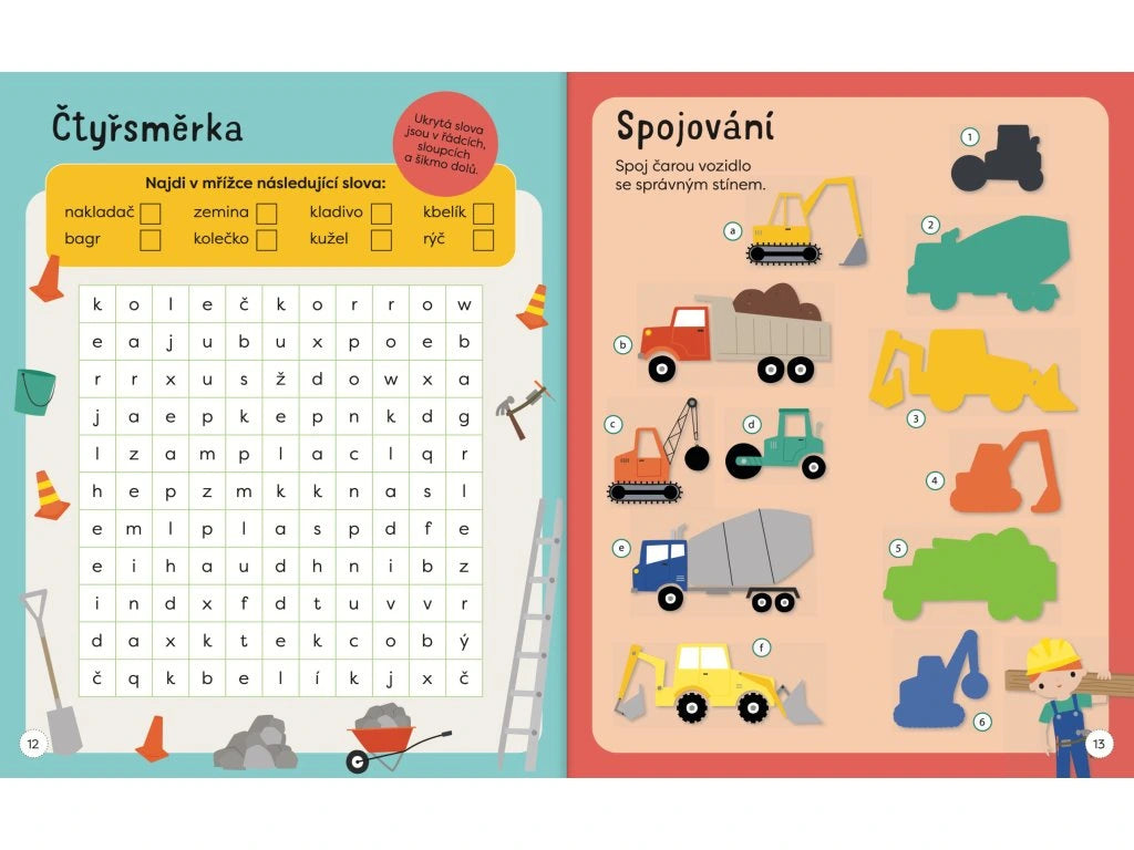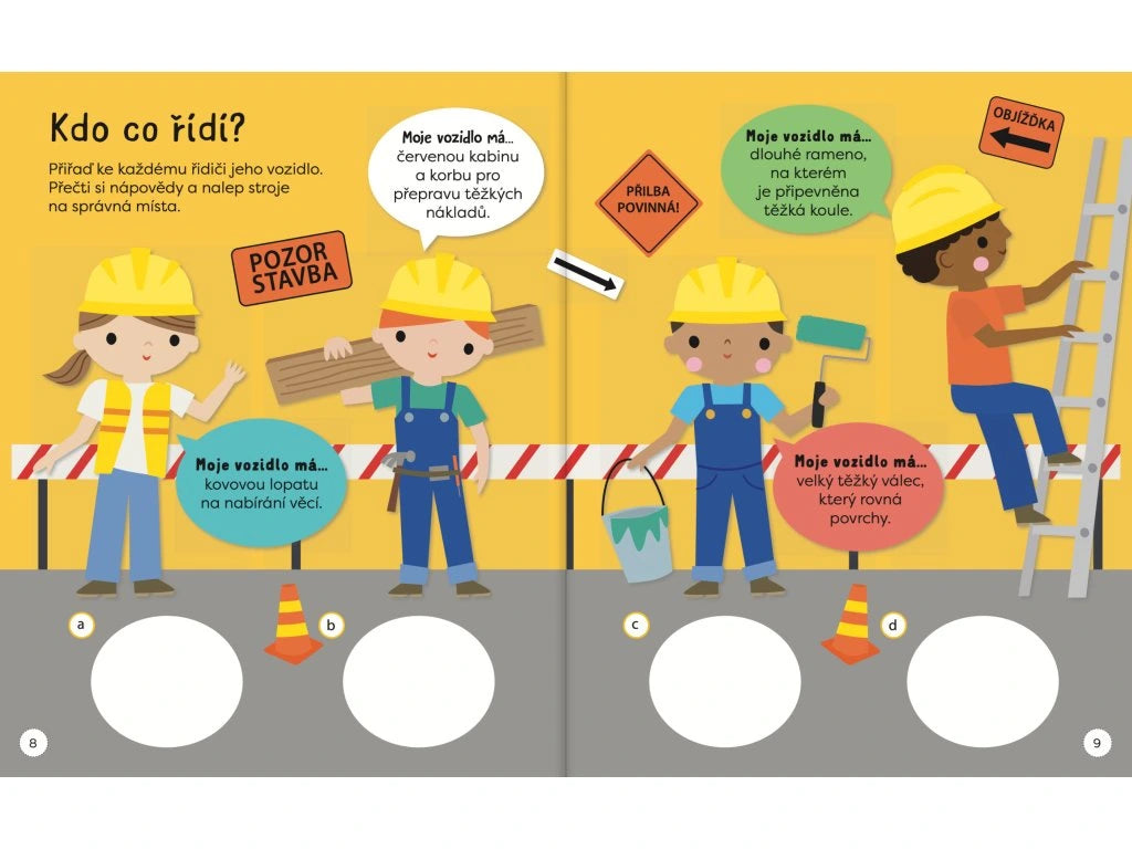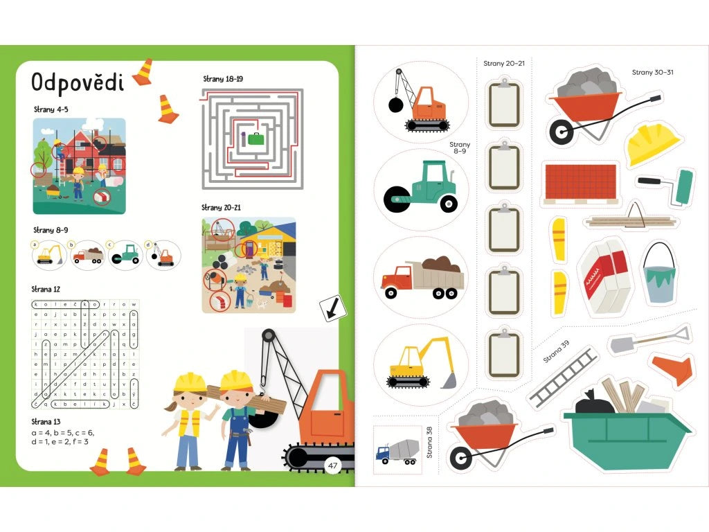 Kniha samolepkových aktivit je plná zábavných úkolů a samolepek k nalepení. Uvnitř knihy se děti seznámí se stavebními stroji a prací na stavbě, zatímco budou hledat rozdíly, doplňovat, obtahovat, počítat, spojovat, vybarvovat a nalepovat samolepky. Při těchto činnostech si dítě zároveň zlepší koordinaci oka a ruky, jemnou motoriku a soustředění. Tak hurá na stavbu, zábava může začít!