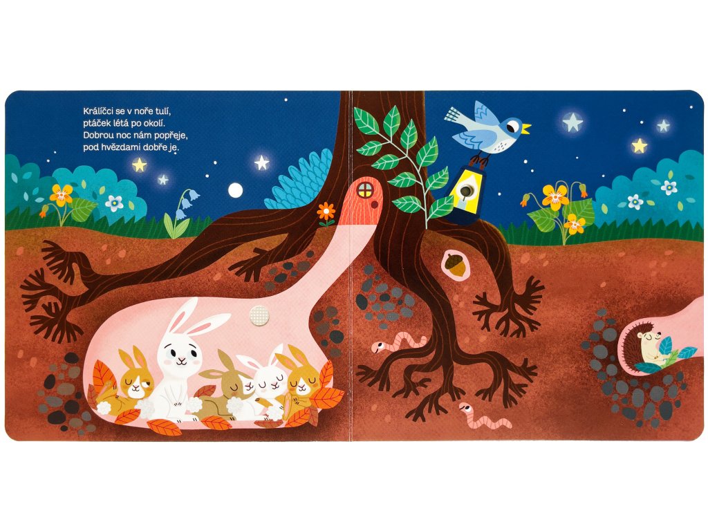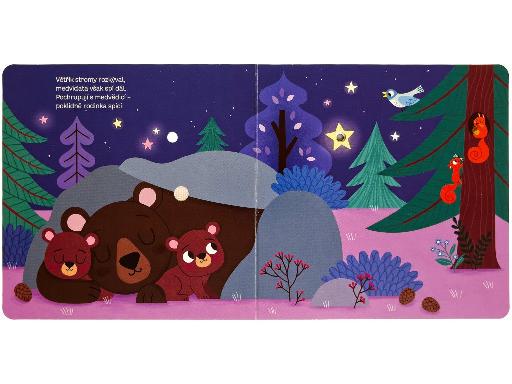 Nastává noc a některá lesní zvířátka se ukládají ke spánku. Nech se ukolébat ke spánku i ty s touto veršovanou knihou se zvuky a blikajícími světýlky.