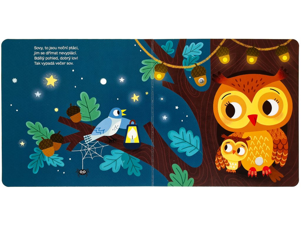 Na noční obloze vyšly první hvězdy a lesní zvířátka se chystají spát. Když se v listnatém lese zešeří a oblohu nad stromy prozáří hvězdičky, zaletí malý ptáček popřát dobrou noc všem svým zvířecím kamarádům. Za svitu měsíce spatří báječné věci. Pojď si je také prohlédnout a poslechnout! Vydej se za zvířátky do lesa s touto veršovanou zvukovou knihou s blikajícími světýlky a zjisti, která zvířátka šla spát a která se naopak probouzí. Společně si předčítejte milé verše, posviťte si na zvířátka a nechte se pomalu ukolébat ke spánku.