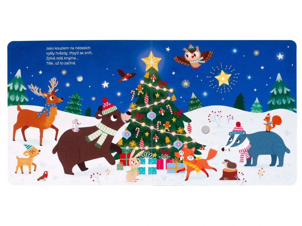 Když se v zasněženém zimním lese přiblíží Štědrý den, zvířátka už se začínají těšit na Vánoce. Pozorují hvězdy na obloze, naslouchají cinkotu zvonečků a rozhodnou se ozdobit stromeček. Nadílka už se blíží! Co pěkného si budou přát? Tato vánoční knížka ve verších se zvuky a blikajícími světýlky vám pomůže ponořit se do sváteční atmosféry. Společně s dětmi si předčítejte milé verše, poslouchejte zvuky lesa a užívejte si kouzelná světýlka. Ideální pro předvánoční pohodu a čekání na Ježíška.