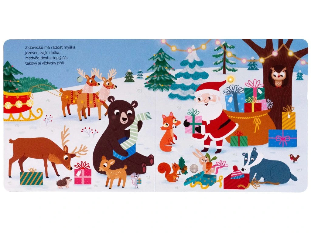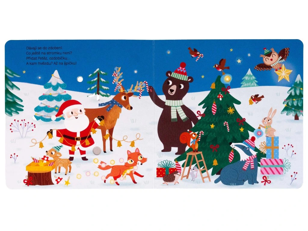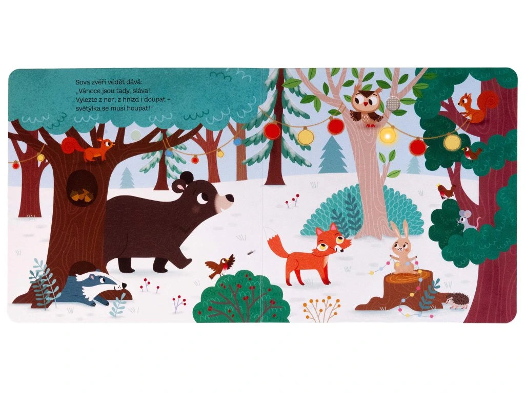 V zasněženém lese se zvířátka chystají na Vánoce. Tato veršovaná knížka s blikajícími světýlky a zvuky vám vykouzlí sváteční náladu.