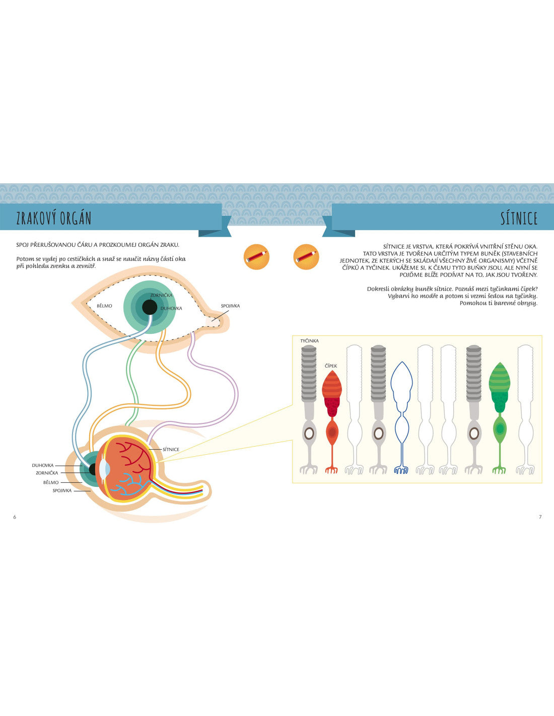 Děti se v knize pomocí vybarvování, dokreslování čar, rozlišování tvarů a barev a nalepování samolepek seznámí s jednotlivými smyslovými orgány a prozkoumají jejich části i funkce. Současně se na základě principů montessori pedagogiky rozvinou také jejich kognitivní schopnosti.