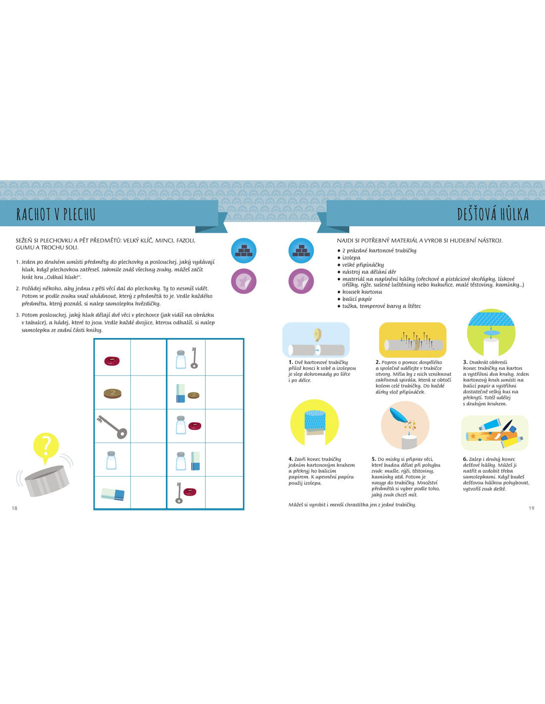Dokážeš podle siluety zjistit, kdo létá ve tmě po obloze? Odhalíš, který z předmětů dělá hluk v plechovce? Uděláš si zvláštní hudební nástroj - dešťovou hůlku? Když s ní budeš pohybovat, vytvoříš zvuk deště. Povede se ti se zavázanýma očima, tedy jen čichem, přijít na to, jaká jídla ochutnáváš? Vypátráš hmatem, jaké předměty skrývají balonky?