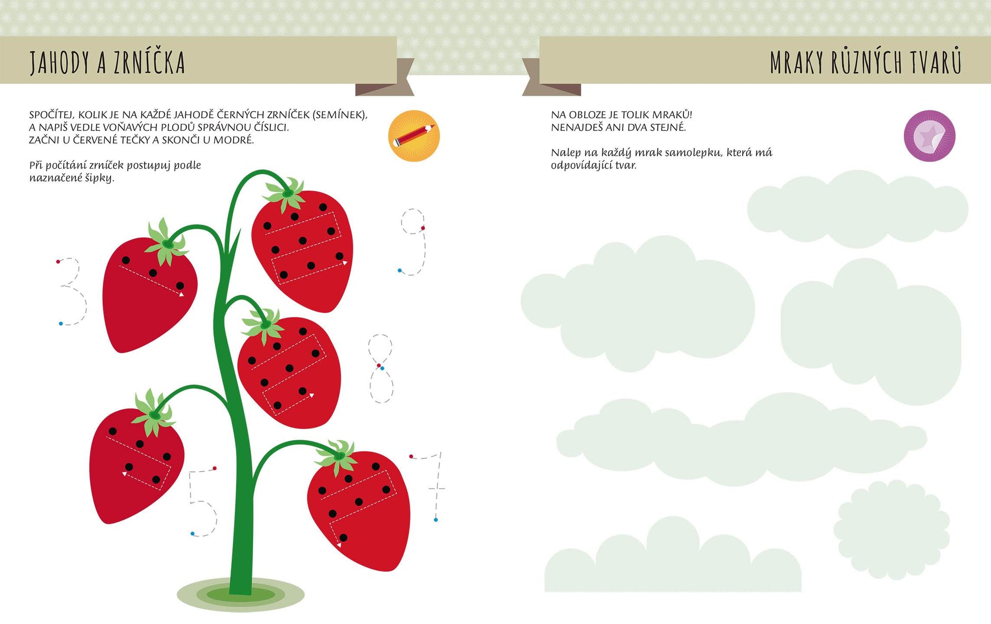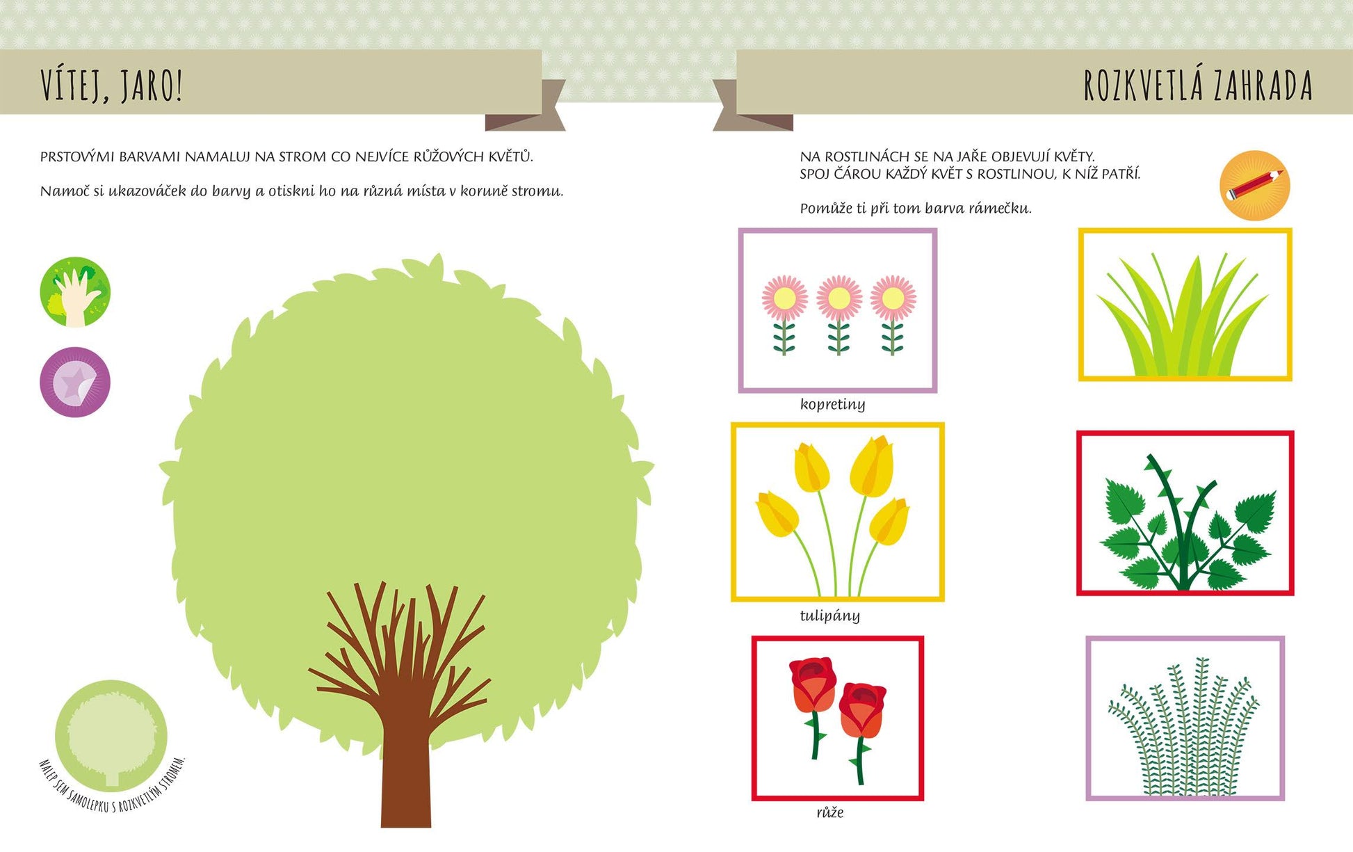Pomocí různých zajímavých úkolů a her si uvědomíš, jak se roční období za sebou střídají a jak se od sebe liší. Na jaře budeš třeba probouzet zvířata ze zimního spánku nebo pomáhat hmyzu opylovat květiny. V létě můžeš poznávat obyvatele moře a do siluet lepit samolepky správného živočicha. V tomto ročním období si pochutnáváme na cukrovém melounu, jistě nebude na škodu, když se dozvíš, jak roste. Na podzim je užitečné sbírat barevné listy a učit se je poznávat podle tvaru a barev. Veverce jistě poradíš, jak se přes bludiště dostane ke schovaným zásobám oříšků, na které zapomněla. Zima je období, kdy pomáháme ptáčkům přežít mrazy a nedostatek potravy – vybarvíš jim budku a nakreslíš semínka, aby neměla hlad.