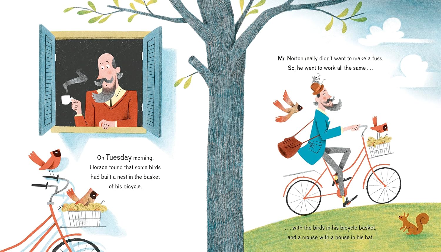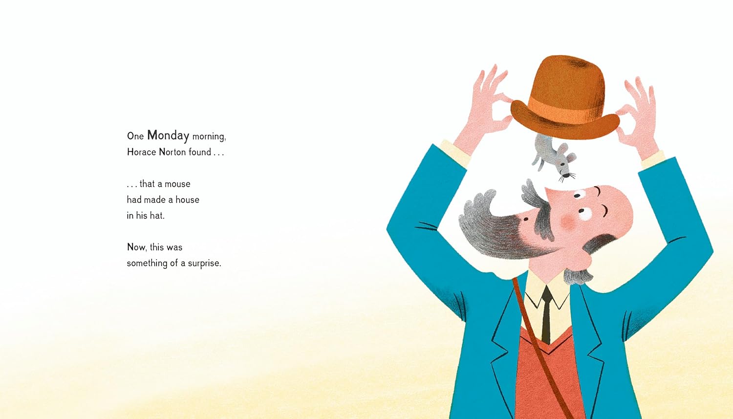 One Monday morning, Horace Norton finds that a mouse has made a house in his hat. On Tuesday, there are birds in his bicycle basket . . . and on Wednesday, a squirrel asleep in his shoe!