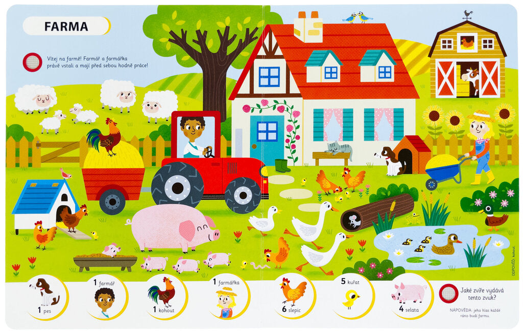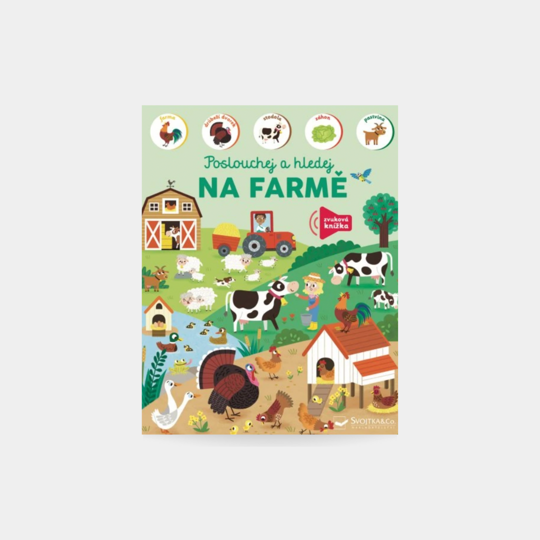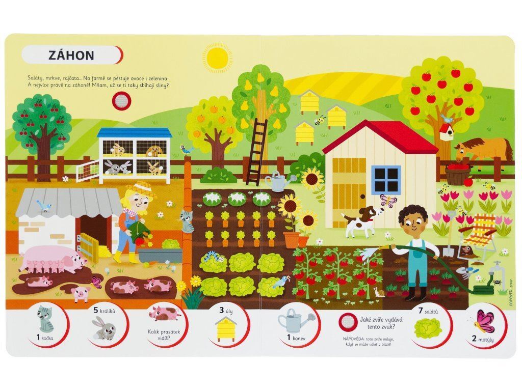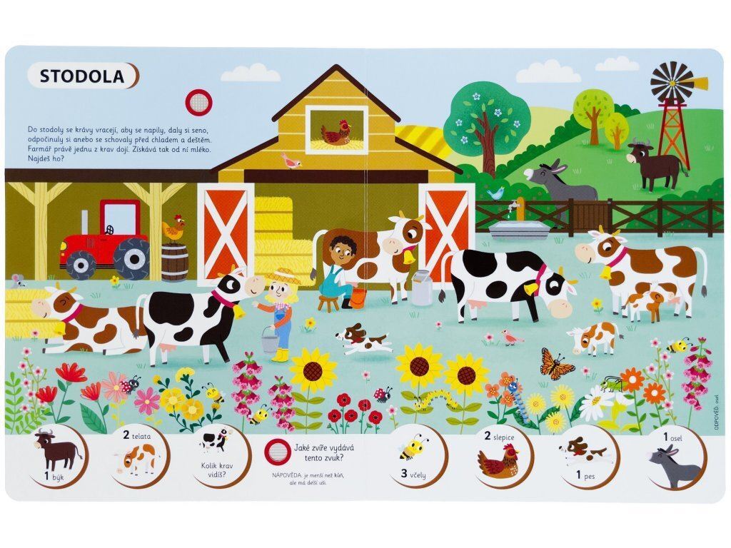 Hledej a poznávej s touto zvukovou knihou zvířata z rušné farmy! V různých částech farmy, od stodoly přes pastvinu až po drůbeží dvorek, se seznámíš s jejími obyvateli a dozvíš se i zajímavé informace. Na každé straně této krásně ilustrované knížky poslouchej nejrůznější zvuky a poznej, která zvířata je vydávají. Ale neboj! Dostaneš k tomu i nápovědy, které ti zvířata představí, a i zde se dozvíš další zajímavosti z farmy a ze zvířecí říše.