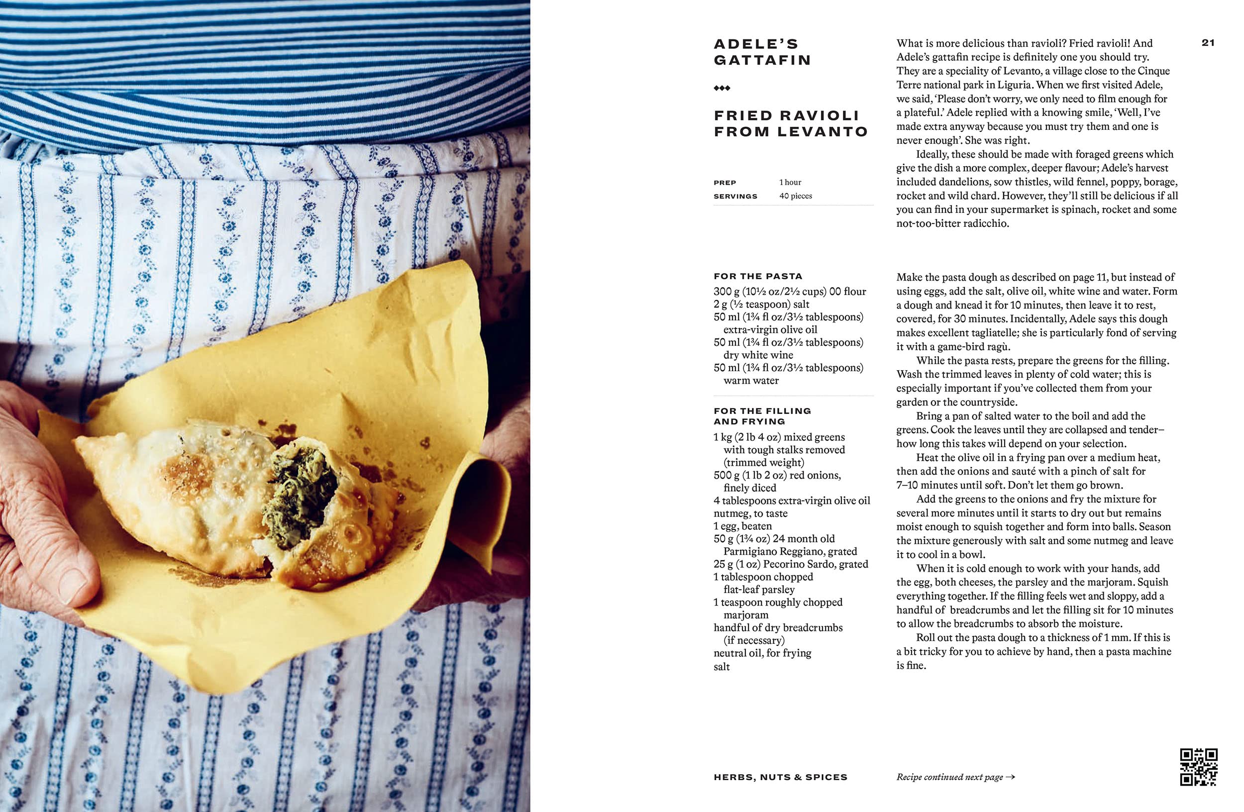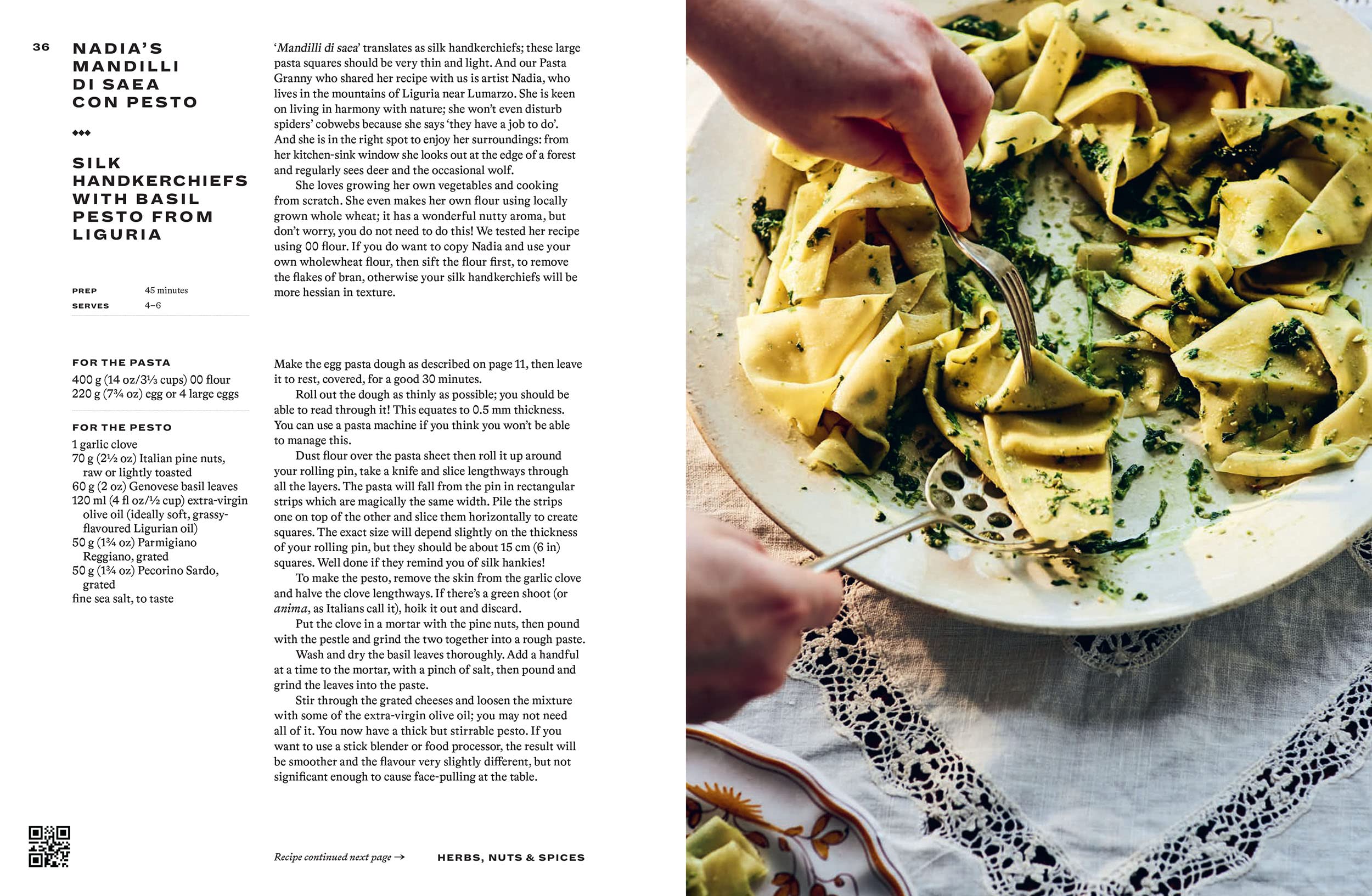Odkryj kasztanowe gnocchi 91-letniej Piny z pesto z orzechów włoskich, pieczołowicie przygotowane ze składników, które uprawia w swoim domu w Ligurii; lub specjalny przepis na tagliatelle 99-letniej Marietty, który tak naprawdę nie jest wcale przepisem, ale odzwierciedleniem jej ogrodu warzywnego, kalabryjskiej wsi i zmieniających się pór roku. Oprócz przepisów na makarony z mięsem, owocami morza i warzywami, rozdziały obejmują pizzę, ciasta i ciasta, ryż i rośliny strączkowe, nabiał i zioła, orzechy i przyprawy.