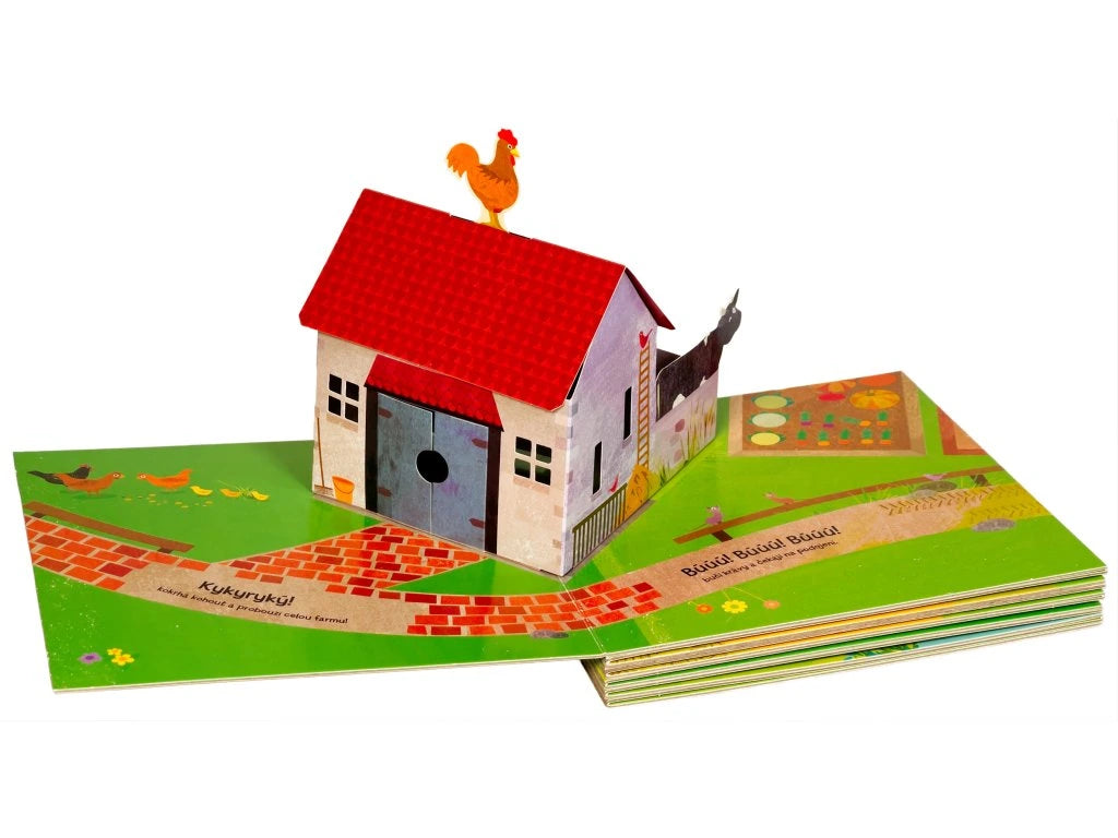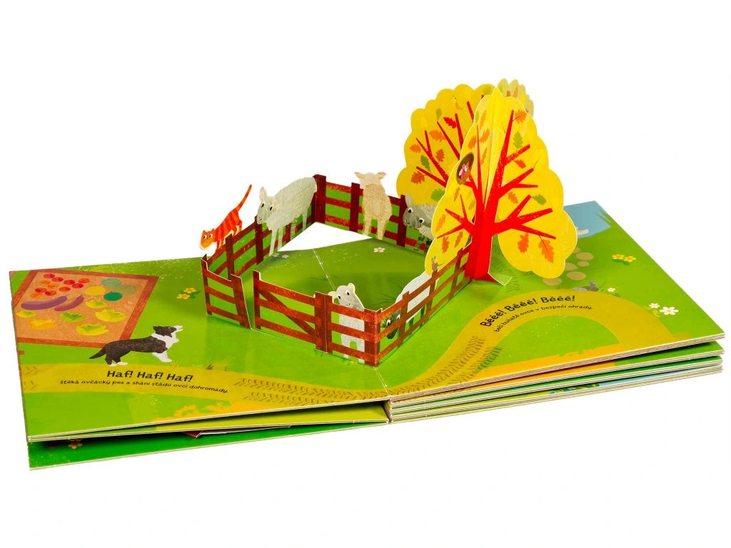 Rozkládací oboustranná kniha s pop-up prvky a papírovými figurkami zaručí spoustu zábavy a i poučení o zvířatech a farmě.