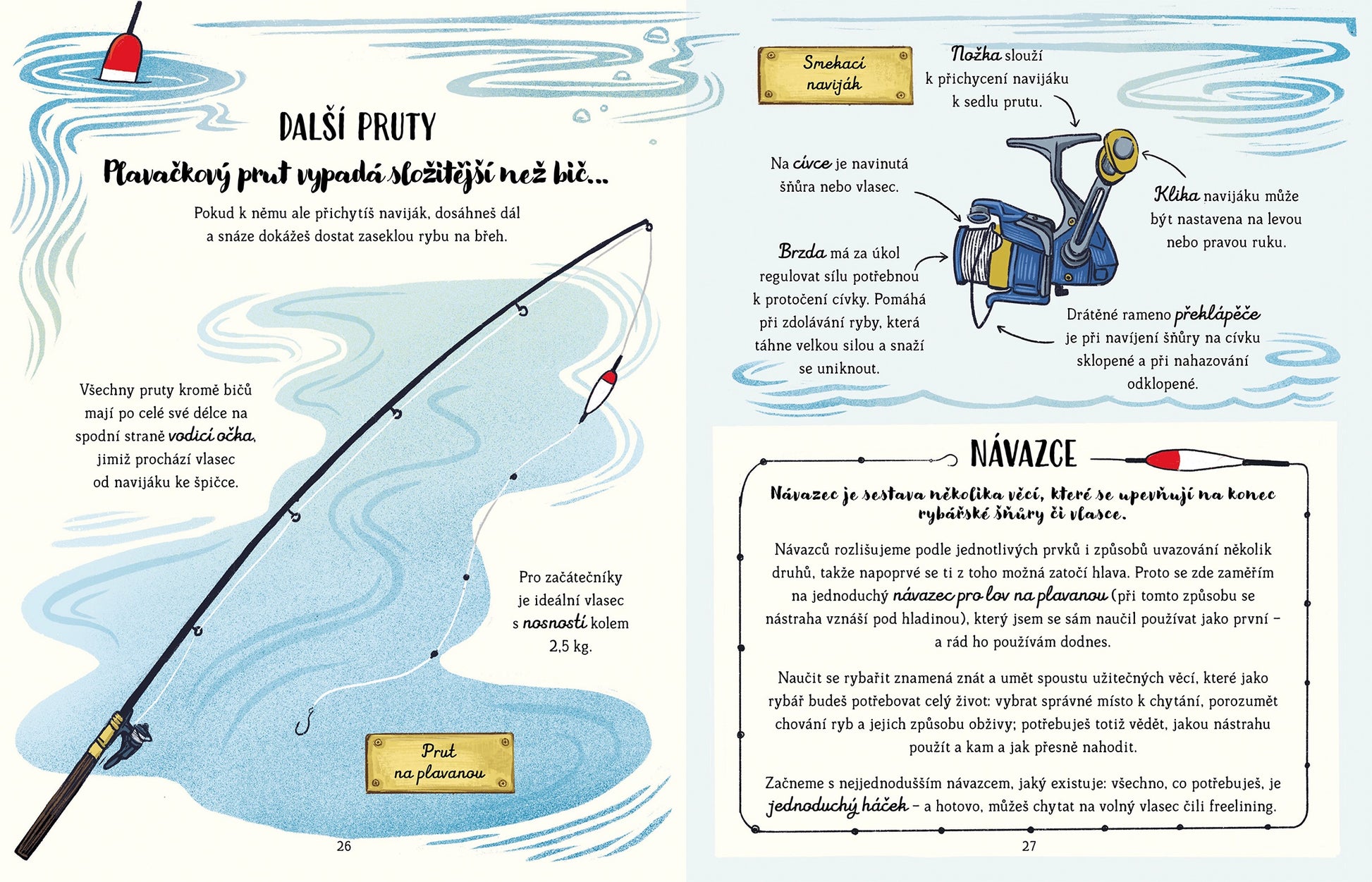 V této bohatě ilustrované knize se dozvíš vše, co budeš potřebovat, až půjdeš poprvé na ryby. Získáš základní informace o prutech, navijácích, vlascích, nástrahách a návnadách, háčcích… Najdeš i charakteristiky našich nejhojnějších ryb. Dozvíš, se co dělat s úlovkem, ať to bude drobná mřenka, nebo kapitální štika, a jak se o ulovenou rybu postarat. Autor knihy Will Millard, zkušený rybář a reportér BBC, bude při tvých prvních výpravách na ryby výborným průvodcem. Poradí ti i nějaké ty fígle, abys chytil rybu svých snů. Kromě dobrých rad si přečteš také zábavné historky z jeho začátků rybaření. Chceš tedy vědět, jaké je tajemství rybaření? Spočívá v poznání, že chytání ryb není tak složité, jak na první pohled vypadá. Dalším předpokladem úspěchu je správné vedení hned od začátku. Ideální je mít někoho, kdo ti ukáže, co a jak dělat. Pokud nikoho takového nemáš (nebo i když ho máš), najdeš v knize spoustu informací a rad, které ti usnadní první rybářské kroky. A když si rybaření zamiluješ stejně jako autor knihy, možná tě překvapí, kam až tě dovede… Zázraky se dějí a budou se dít dál tak dlouho, dokud nepřestaneš věřit, že voda je doopravdy kouzelná.
