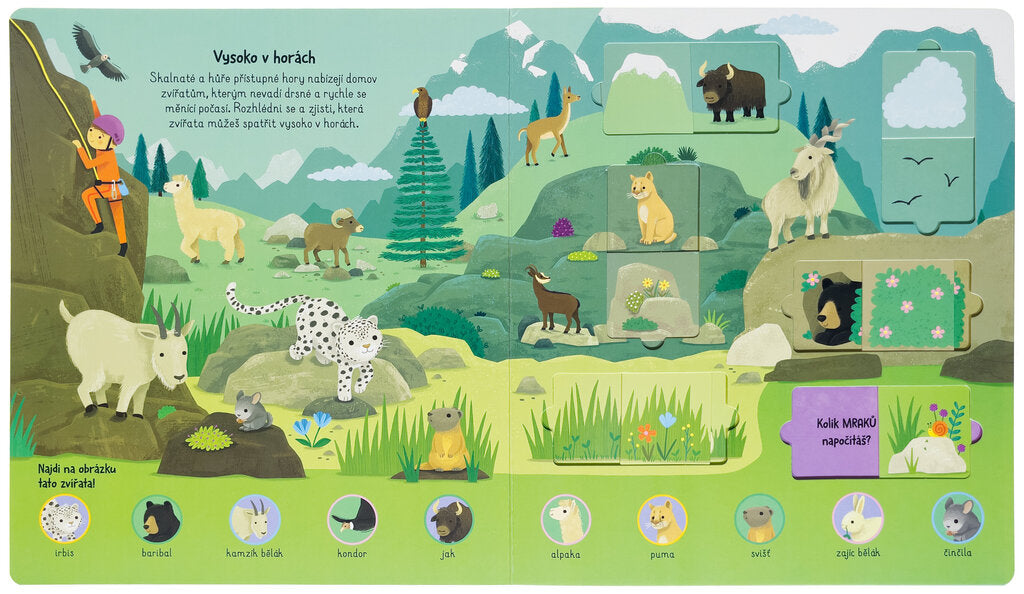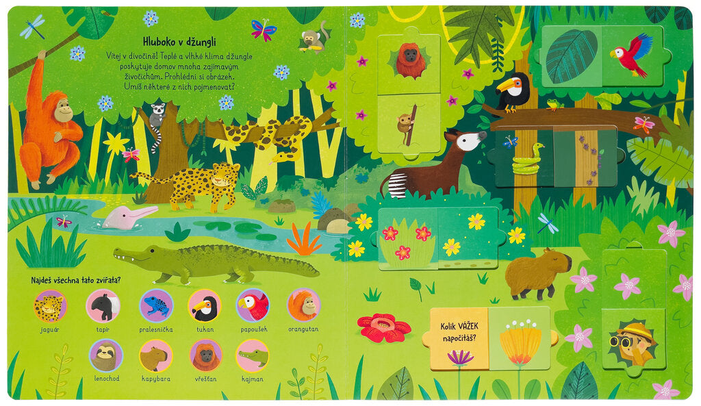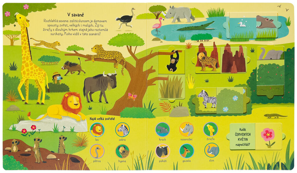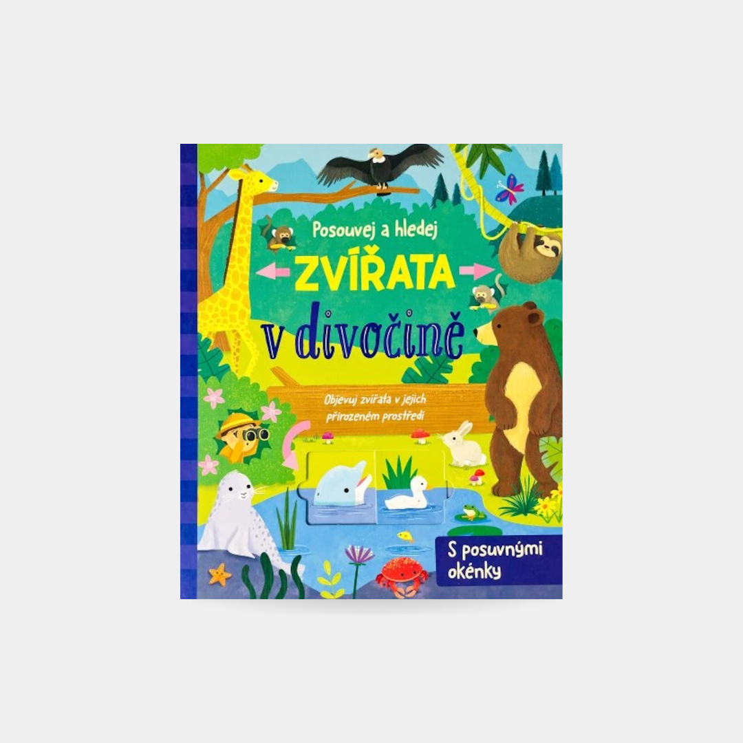 V této knize s posuvnými okénky se děti v 5 různých prostředí seznámí se zvířaty z celého světa. Každé prostředí je krátce uvedeno společně s úkolem na hledání nejrůznějších zvířat. Jasné ilustrace a popisky pomohou dětem lépe poznat říši zvířat a seznámit se s ní. Za posuvnými okénky se poté ukrývají úkoly na počítání a pozornost. Tato interaktivní kniha s roztomilými ilustracemi je ideální volbou pro všechny milovníky i milovnice zvířat a přírody.