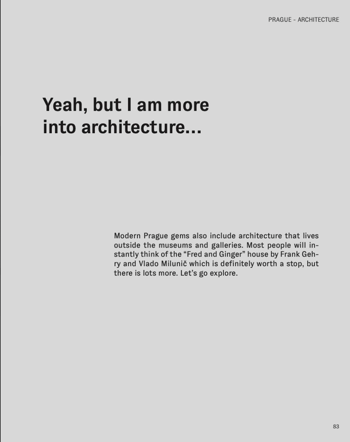 Ten współczesny portret Miasta Stu Wież, napisany przez mieszkańca Pragi i zawierający wskazówki od innych często odwiedzających miasto, pomaga odwiedzającym wyjść poza dobrze znane tradycyjne zabytki i odkryć mniej oczekiwaną, nowoczesną stronę Pragi. Oferuje wyselekcjonowaną, ukierunkowaną na design edycję najlepszych galerii sztuki współczesnej, instalacji artystycznych na świeżym powietrzu i nowoczesnej architektury, a także wspaniałe miejsca na pobyt, jedzenie i zakupy, które pomogą Ci cieszyć się podróżą i zobaczyć Pragę w całkowicie współczesnym świetle.