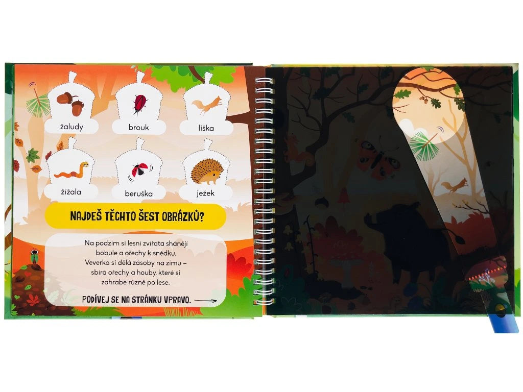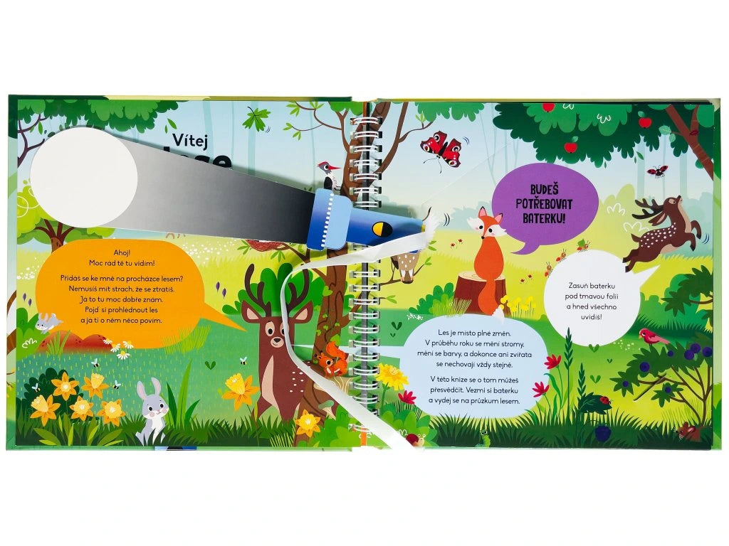 V lese je toho tolik k objevování! Čekají tu na tebe rozverná zvířata a také spoustu krásných rostlin a stromů. Na stránkách hledej ukryté obrázky a zjisti o lese a zvířatech zajímavé informace. Stačí jen zasunout baterku pod tmavou folii a hned všechno uvidíš.