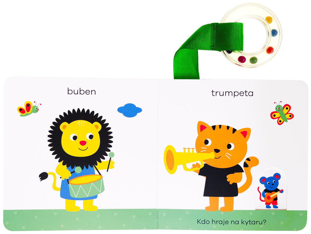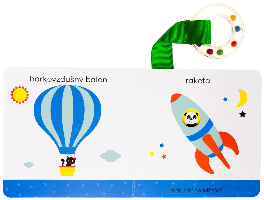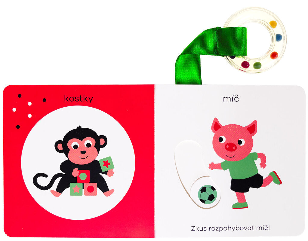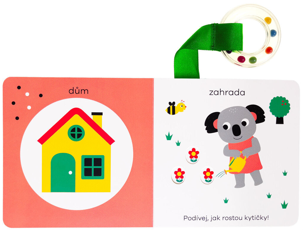 Objevuj první slova - toto leporelo, speciálně navržené pro batolata, je plné překvapení. Stačí knížkou lehce zatřást a objeví se plno nečekaných věcí! Tato knížečka pro miminka je přímo určená k tomu, aby s ní dítě třáslo. Slyšíš, jak chrastí? Kdo vykoukne z okénka, pokud s ní pořádně zatřepeš? Jakékoli mávání knihou rozhýbe pohyblivé prvky v ilustracích, které díky tomu užijí. Děťátko se při prohlížení leporela učí první slova a baví se odhalováním dalších částí knihy, jež nebyly na první pohled viditelné. Navíc je leporelo vybaveno kulatým chrastítkem na látkovém proužku - ideálním na cumlání a ještě více zábavy a rámusení při třesení knihou.