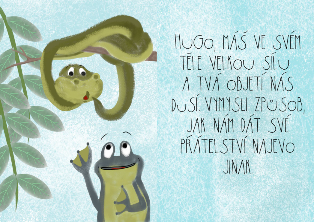 Had Hugo je sice had škrtič, ale je velmi dobrosrdečný a miluje všechny obyvatele lesa. Jeho největší radostí je dávat jim najevo svou náklonnost objímáním. Avšak každý jeho pokus o přátelské objetí končí stejně – nechtěně své přátele přidusí. I když je Hugo oblíbený, začnou se vyděšená zvířátka před ním schovávat. Zoufalý Hugo si neví rady... Přijde na to, jak vyjádřit přátelství jinak? Ve skutečném přátelství jde o respektování hranic druhých, vzájemnou pomoc a porozumění v těžkých chvílích. A právě o tom je poutavý a jednoduchý příběh o Hugovi, kterého si děti zaručeně oblíbí.