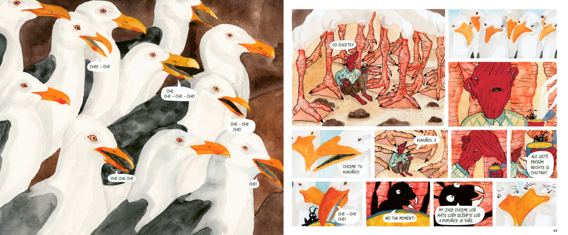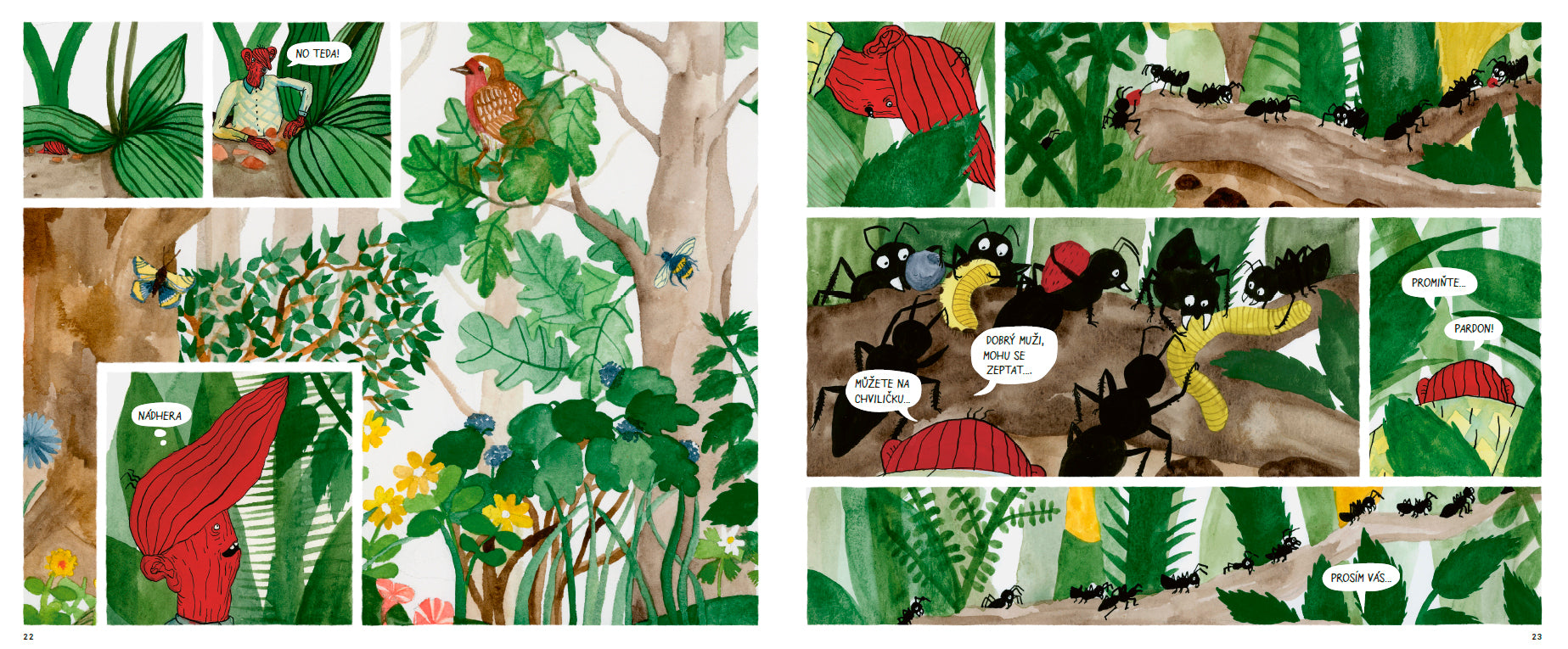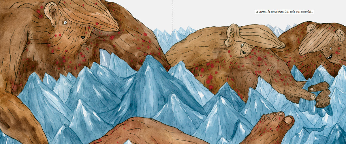 Giganci śpią głęboko pod ziemią. Wykluł się tu także bardzo mały olbrzym, wielkości szyszki świerkowej, dlatego zaczęto go nazywać Świerk. Z czystego niepokoju udaje mu się obudzić ze snu gigantycznych starszych, którzy opowiadają mu o starożytnym Imperium Gigantów, a następnie ponownie zasypiają. Smerfetka dowiaduje się, że w Imperium Gigantów nie było czasu na bezczynność we wnętrzu nieznanego wulkanu, starożytni giganci biegali po świecie, goniąc dinozaury, przenosząc całe góry czy depcząc doliny. Ale potem nadeszła epoka lodowcowa i nagle nasza ziemia nie wystarczyła gigantom. Wiedzieli już wszystko, więc zaczęli się leniuchować. Ale Smurkovec tak nie zostawia i postanawia wyruszyć w podróż. Udaje mu się wgryźć w powierzchnię ziemi i nie wystarczy zachwycać się pięknem. Wkrótce spotyka mrówkę Miloša, która zostaje jego wiernym przyjacielem i wspólnie poszukują Imperium Gigantów. Czy pokonają wszelkiego rodzaju pułapki i naprawdę odnajdą mityczną krainę, czy może już dawno zniknęła? Akwarelowa opowieść wciągnie dzieci i ich rodziców w osobliwy świat dziwnych stworzeń. Pokazuje im, że nawet najmniejsi mogą pokonać naprawdę duże pułapki, jeśli starczy im odwagi, dowcipu i przyjaciela Miloša u boku. Poetyka Smrkovców przypomina dzieła Františka Skáli, film Kuky se várky czy gry studia Amanita Design. Ale przede wszystkim przedstawia swojego autora jako gigantyczny talent czeskiego komiksu.