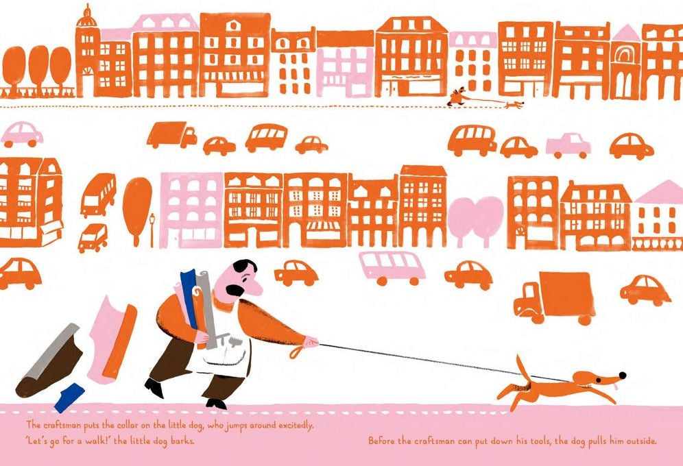 Pes je tak nadšený, že vezme řemeslníka na procházku městem. A právě během této procházky začíná série drobných setkání: