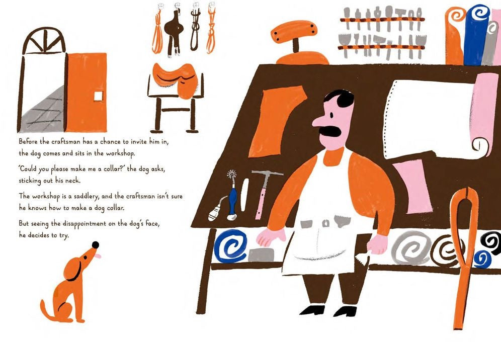 Příběh začíná v malé sedlářské dílně. Jednoho dne přijde pes s prosbou – potřebuje obojek. Řemeslník zpočátku váhá, protože vyrábí vybavení pro koně, ne pro psy. Nakonec ale souhlasí.