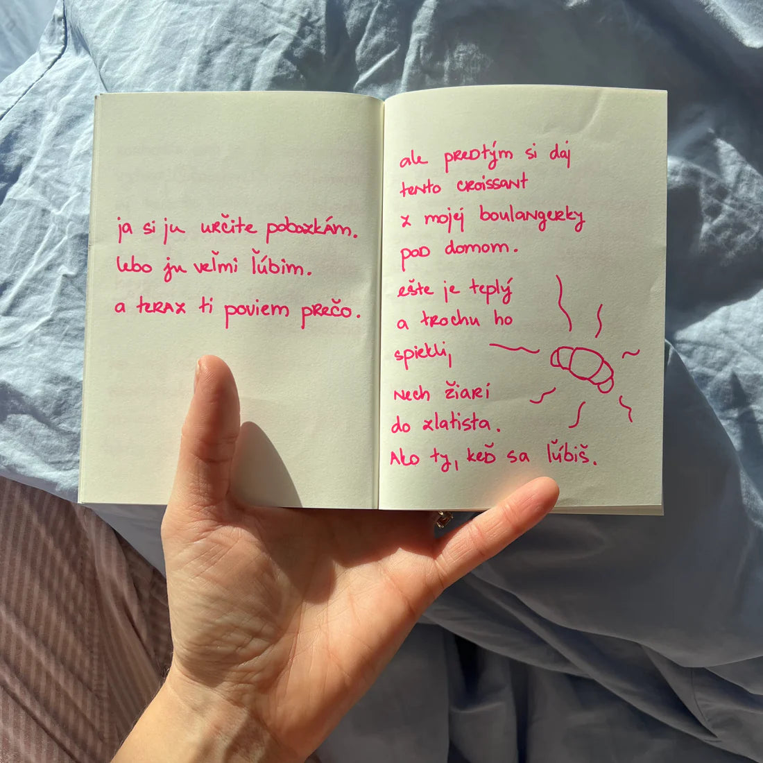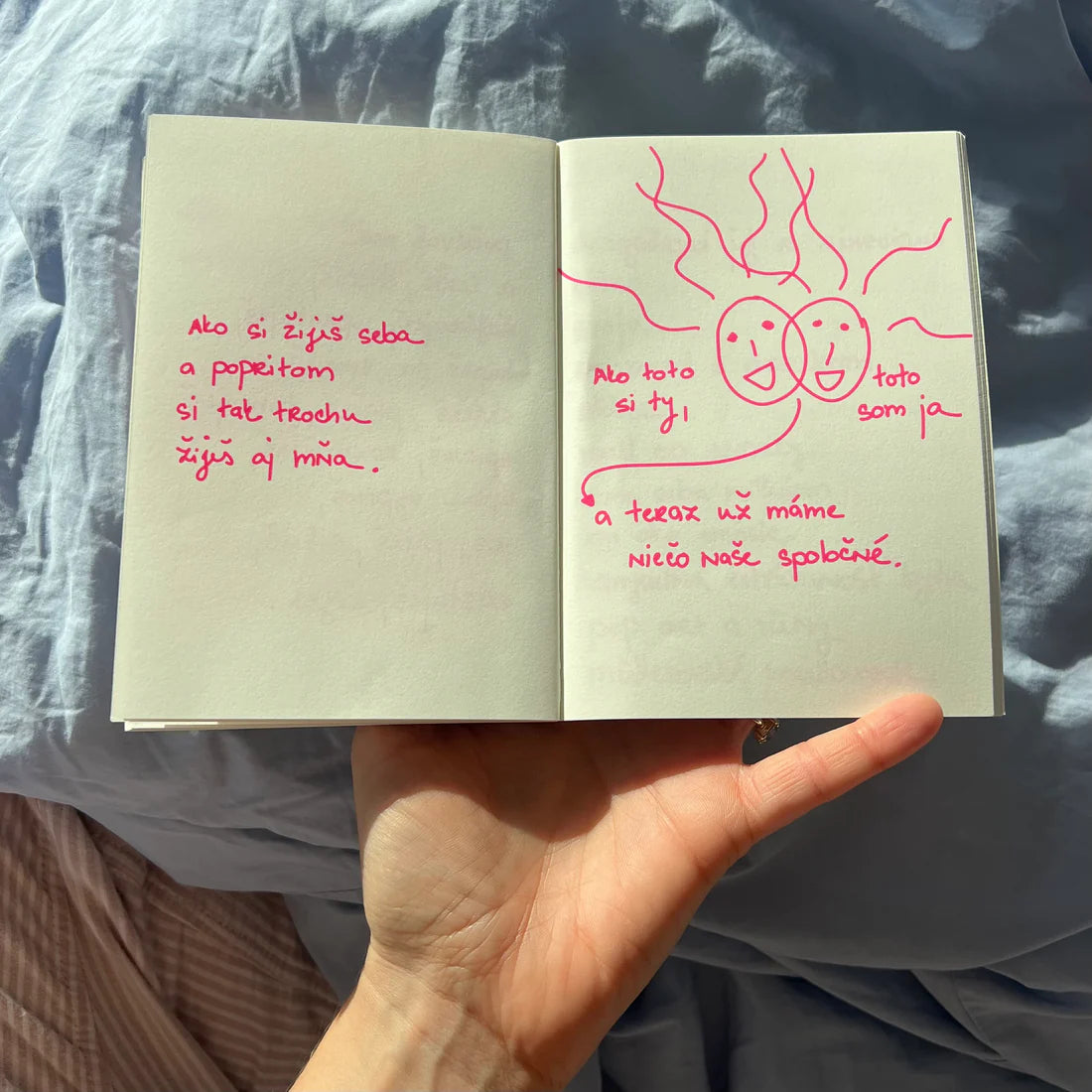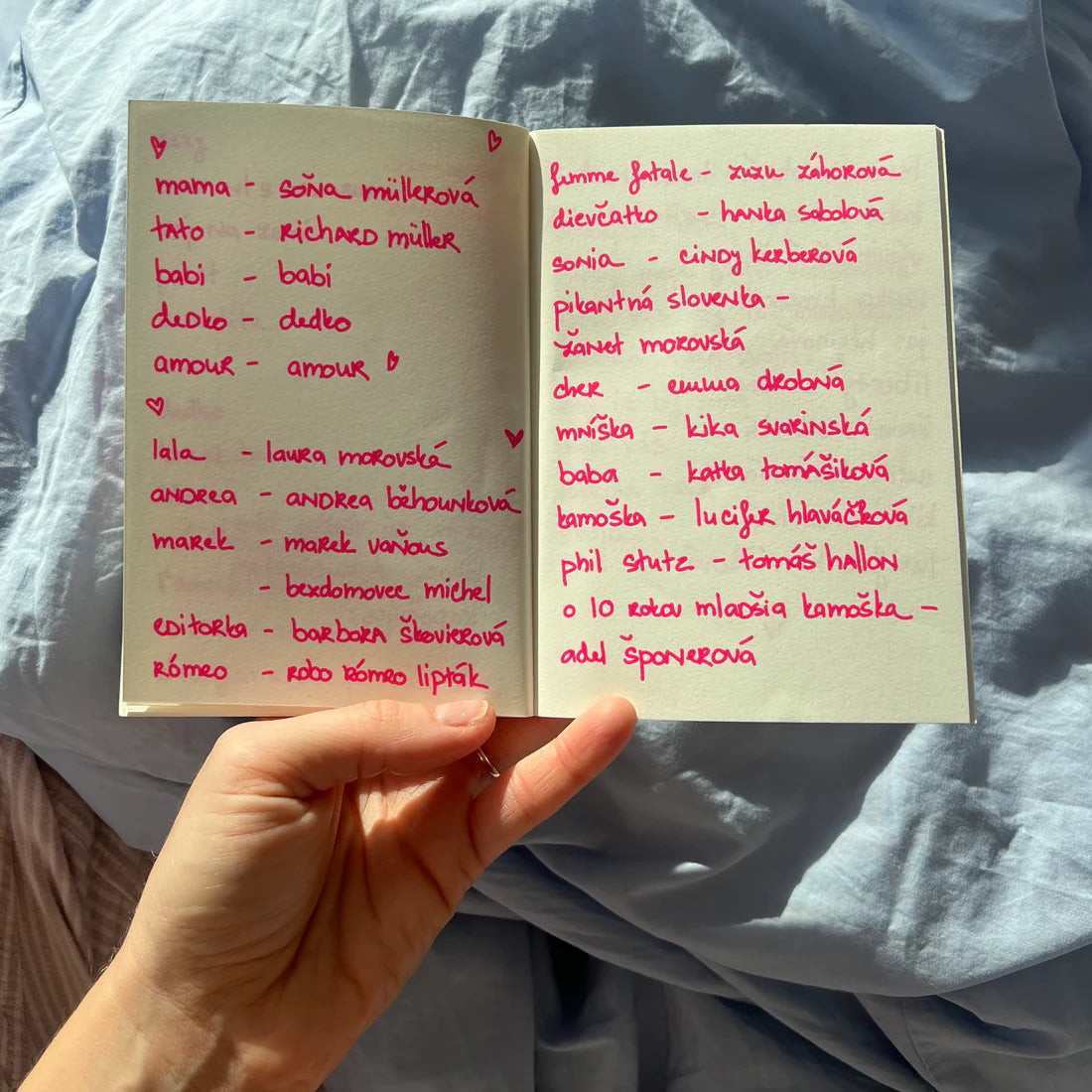 teksty wzbogacają moje pisane pamiętniki, zdjęcia z dzieciństwa, zdjęcia z telefonu komórkowego i zdjęcia wspaniałego Jakuba Gulyása, które robiliśmy razem przez te pięć lat, głównie w jego salonie. Przejrzałem swój egzemplarz przed wydrukowaniem i napisałem notatki różowym markerem, który w końcu w nim zostawiliśmy.