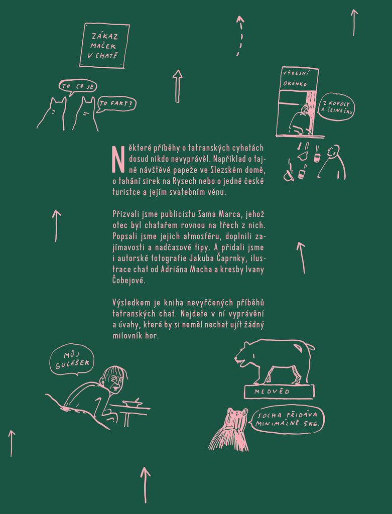 Księga nieopowiedzianych historii tatrzańskich chat. Znajdziecie w nim historie i refleksje na temat drobnych zdarzeń, ale także prawdziwe legendy, których nie powinien przegapić żaden miłośnik gór. Dowiecie się na przykład o tajnej wizycie Papieża w Domu Śląskim, losowaniu zapałek na Rysach czy o czeskiej turystce i jej posagu ślubnym. Ich autorem jest felietonista Samo Marec, którego ojciec był lokatorem na trzech z nich. Jednak to nie koniec. Dla każdego z 13 czatów opisaliśmy atmosferę, dodaliśmy ciekawostki i ponadczasowe wskazówki. Dodaliśmy także oryginalne fotografie Jakuba Čaprnki i rysunki Ivany Čobeyovej. Każda chata otrzymała także własną, oryginalną ilustrację autorstwa naszego ulubionego pustynnego autora Adriana Macha.