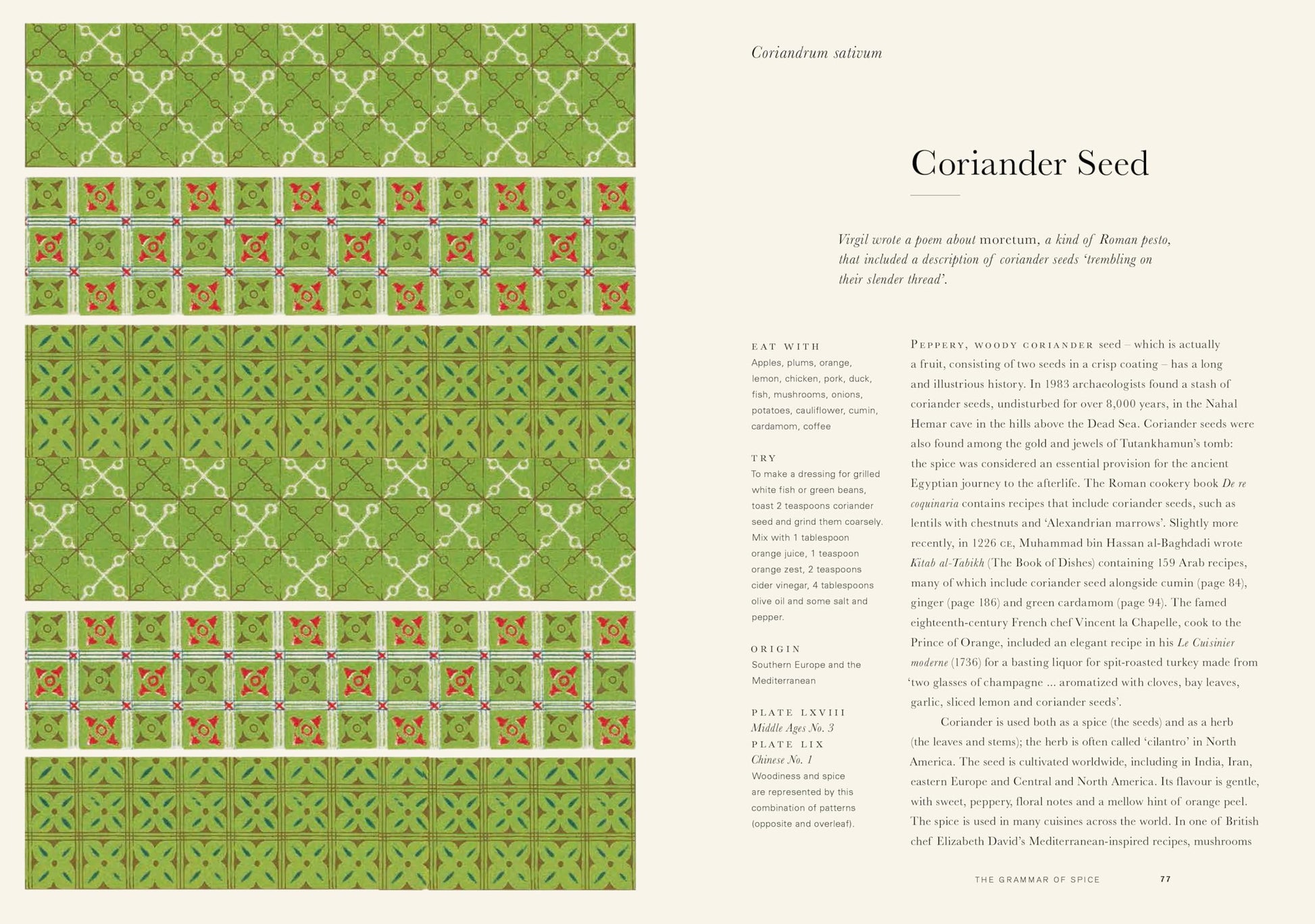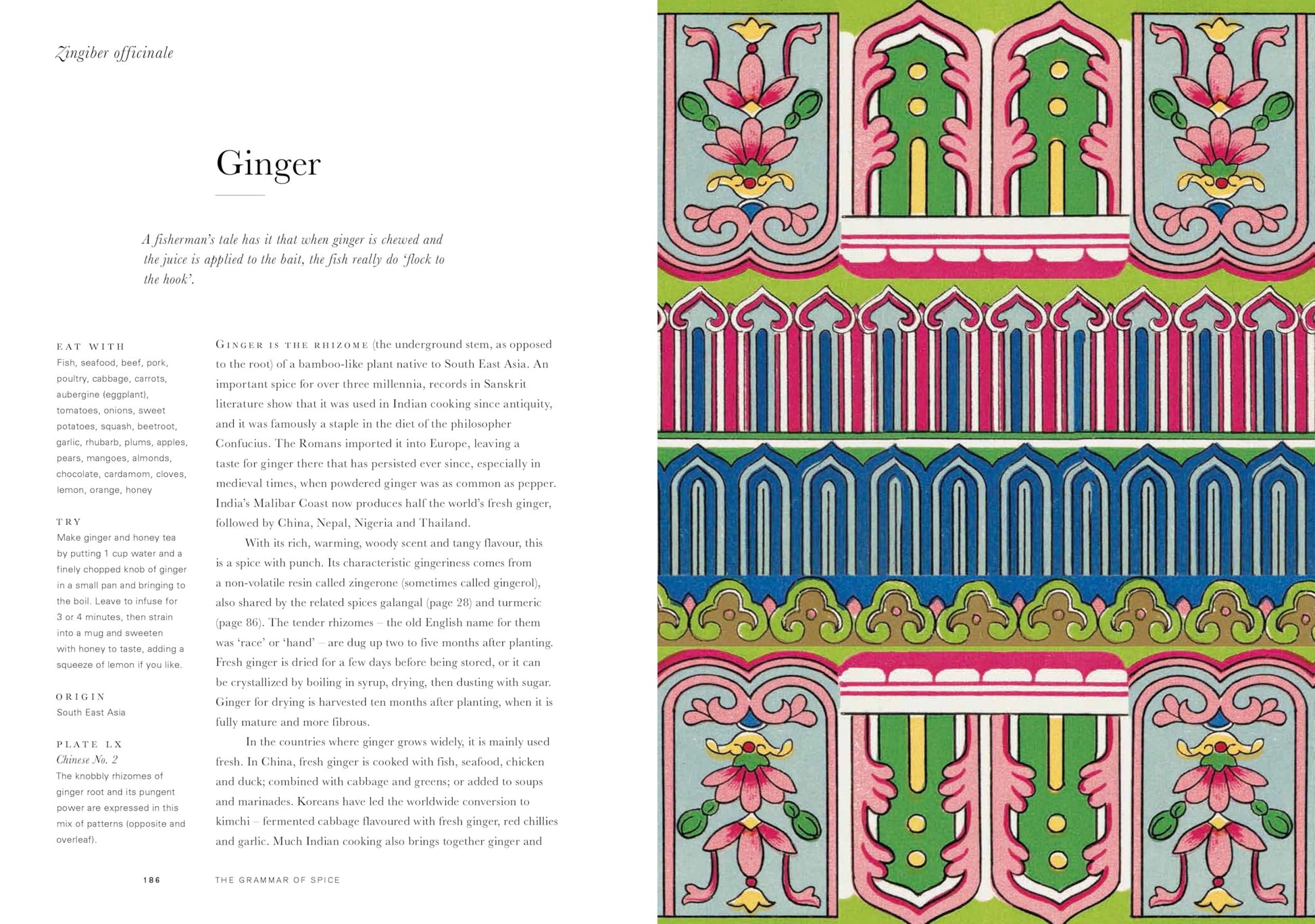 Silnou stránkou je vizuální jazyk. Každé koření doprovází ornamentální ilustrace inspirované historickým designovým dílem The Grammar of Ornament od Owena Jonese. Výsledkem je kniha, která působí téměř jako designový atlas chutí.