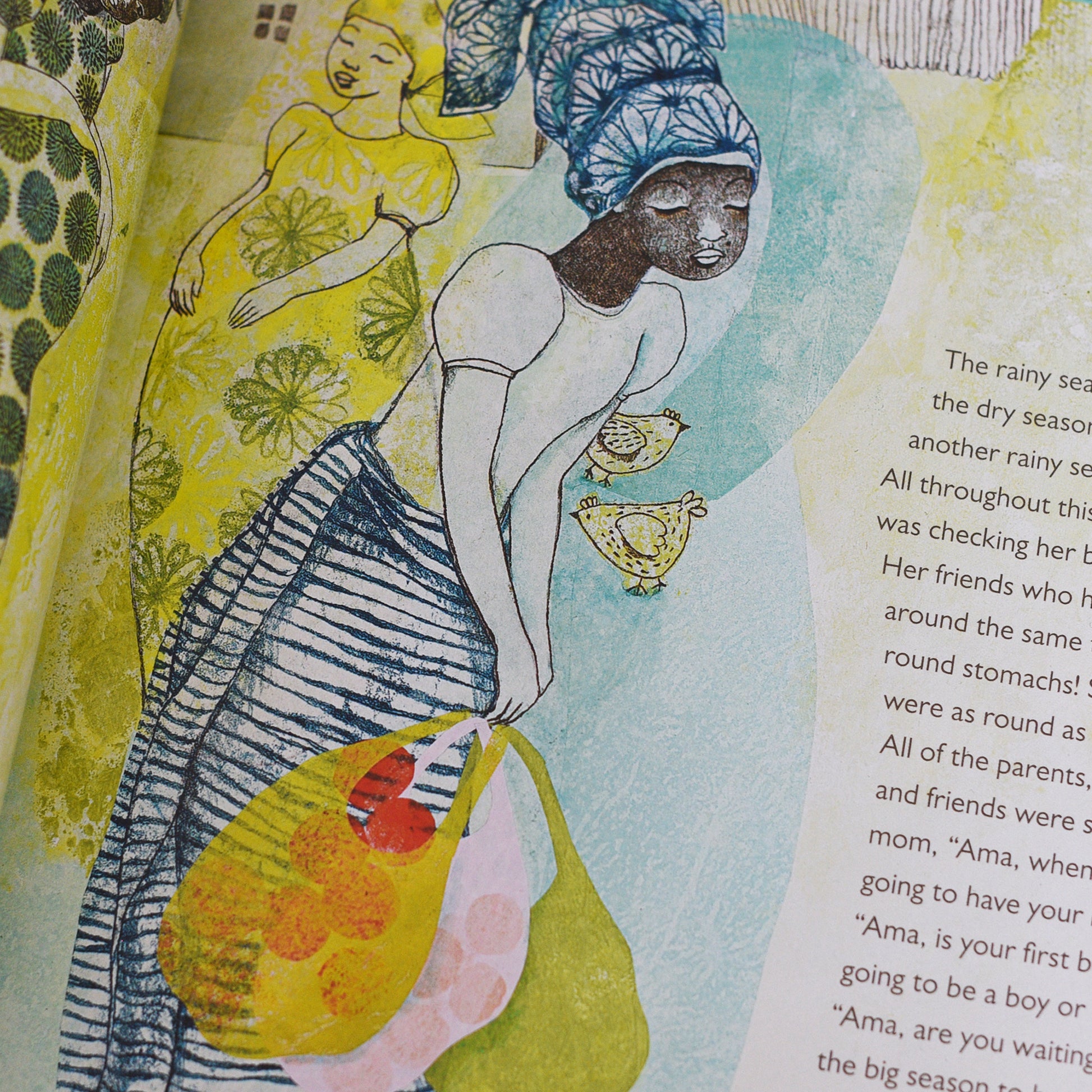 W małej wiosce w Afryce Zachodniej młoda dziewczyna wyjaśnia, w jaki sposób się urodziła. Jej matka miała trudności z zajściem w ciążę, dlatego szuka pomocy w postaci lalki, którą traktuje jak ludzkie dziecko, nosząc ją na plecach i osłaniając pocałunkami. Mijają miesiące i wreszcie kobiecy brzuch zaczyna rosnąć! Ta piękna historia przedstawia dane dotyczące płodności mieszkańców Akua-Ba w Ghanie, a jednocześnie ukazuje głęboką miłość matki do swoich dzieci. Subtelne, wspaniałe ilustracje Élodie Nouhen łączą kolaż i grafiki, które przypominają tradycyjną sztukę afrykańską, a jednocześnie są wyjątkowo współczesne. Każda rozkładówka oddaje wygląd i klimat Afryki Zachodniej – płonącą żółć słońca, głęboki błękit nieba, tkaniny o bogatych wzorach oraz żywą florę i faunę. Tekst Adrienne Yabouzy odzwierciedla rytm życia jej ojczyzny – Republiki Środkowoafrykańskiej. Książkę zamyka krótkie wprowadzenie do sztuki afrykańskiej i znaczenia posągów płodności w kulturach afrykańskich.