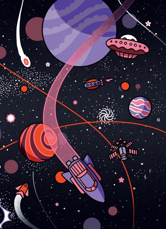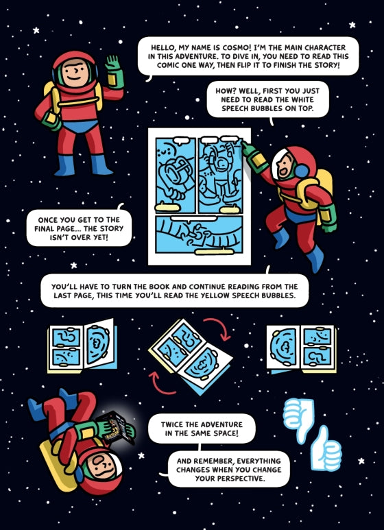 The Spectacular Space Loop je originální dětský komiks o mezihvězdném dobrodružství, které čtenář prožívá ve dvou směrech – čte nejprve běžně a pak převrátí knihu vzhůru nohama pro pokračování v anti-gravitaci.